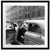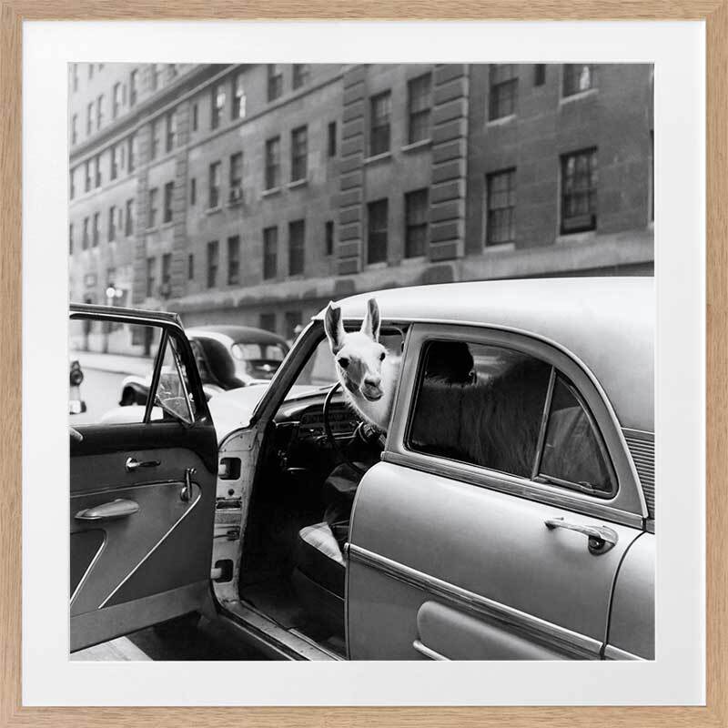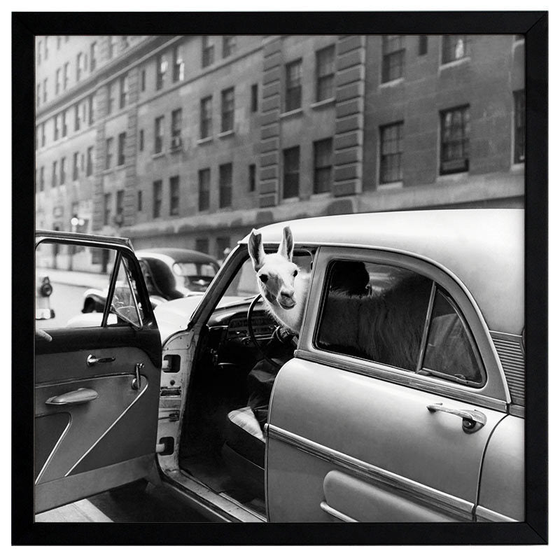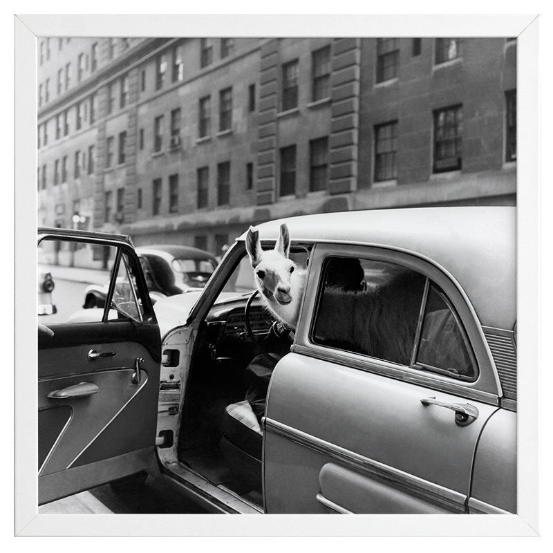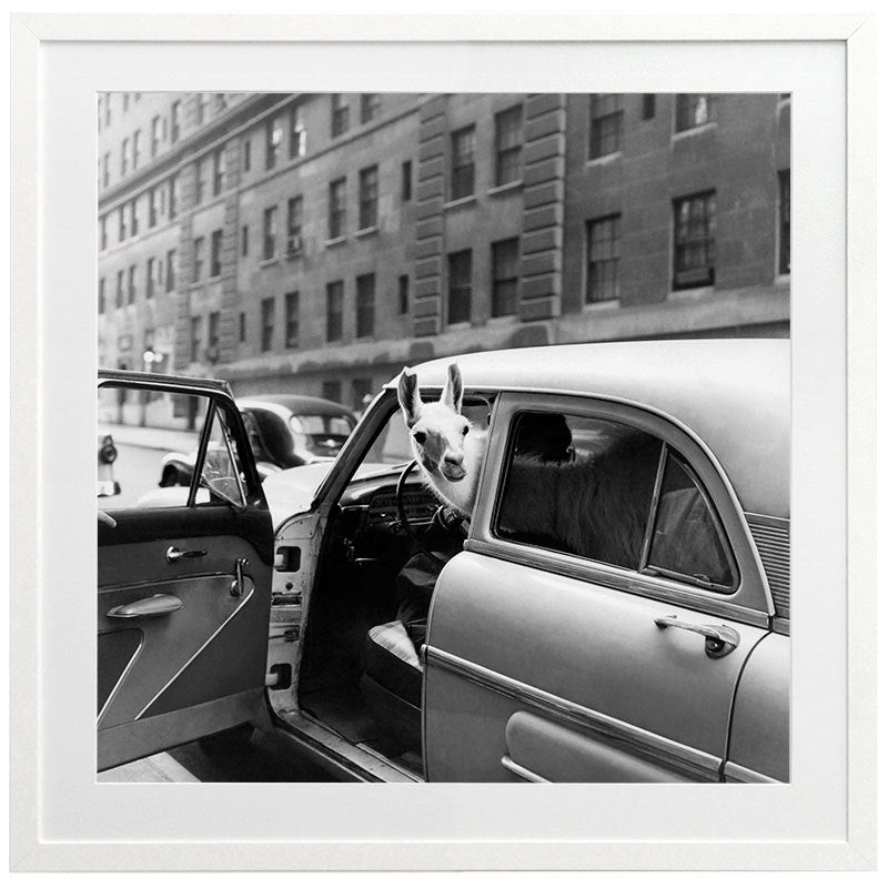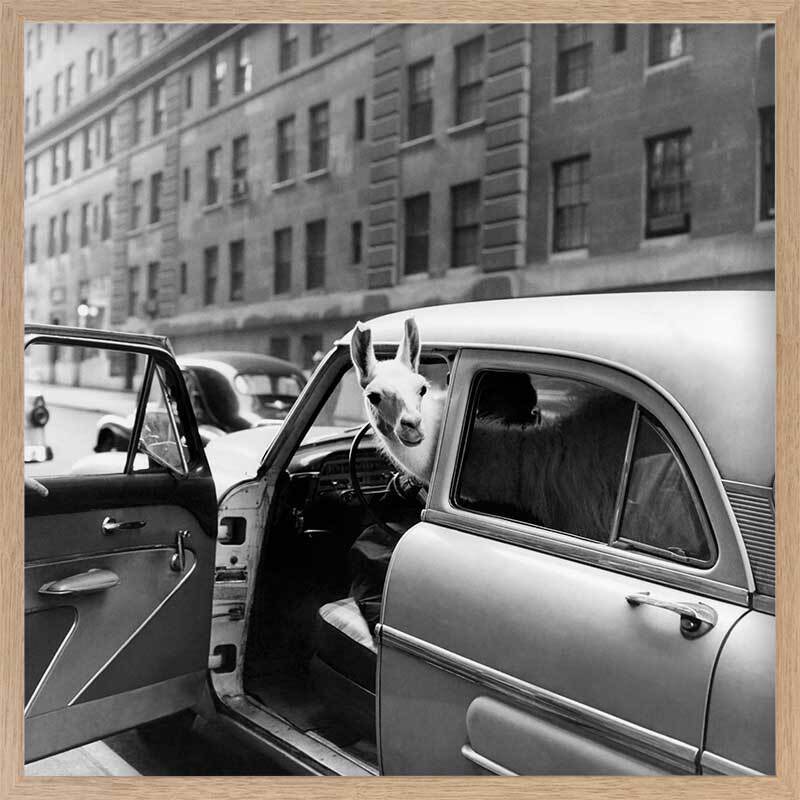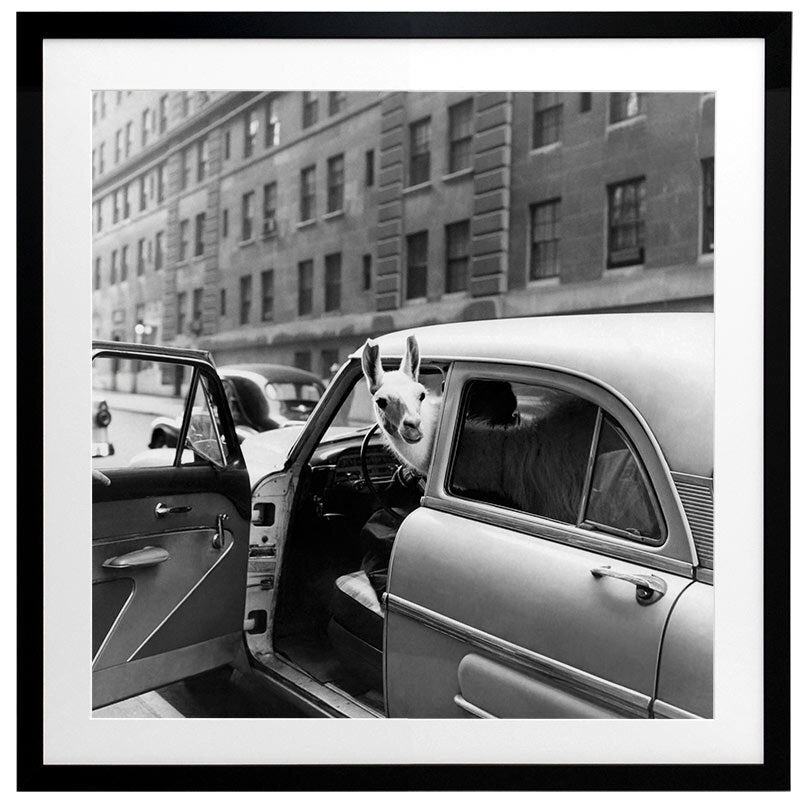 Linda Llama Framed Print: A vintage black and white photographic image of Linda the Llama in a car in Times Square. 2018 AUTUMN/WINTER COLLECTION: CONTINUUM