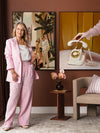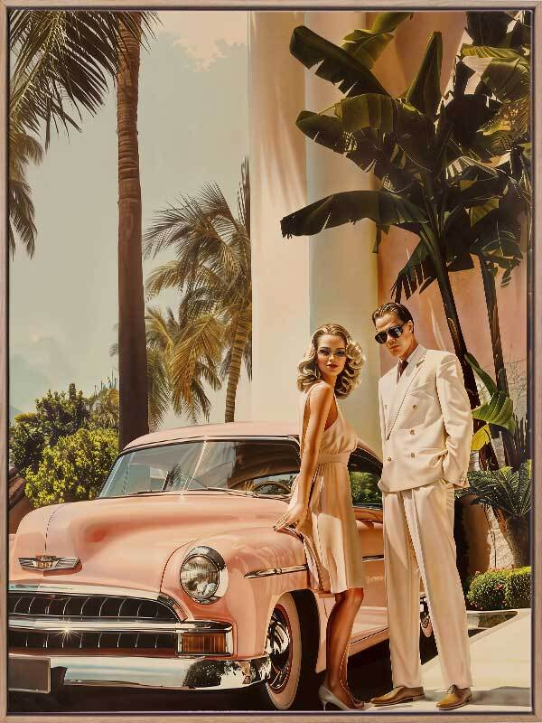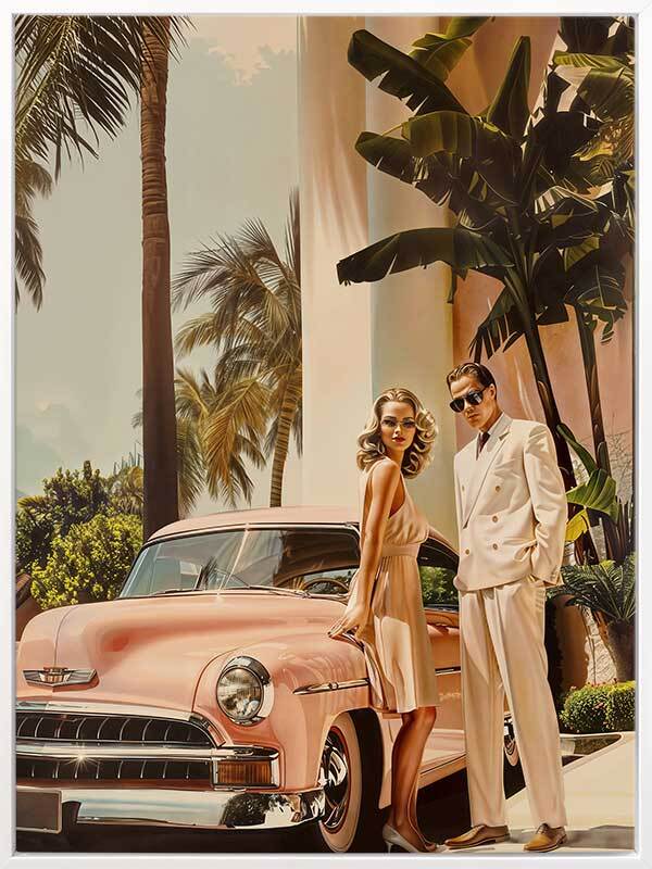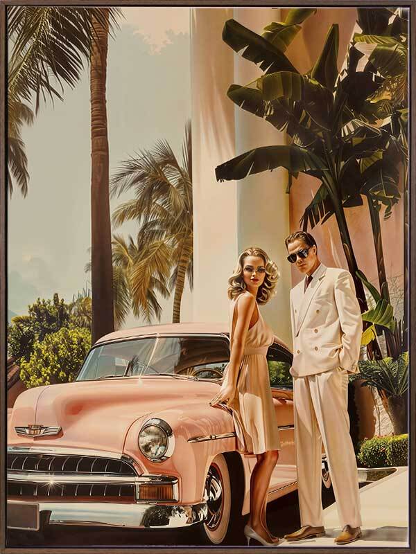 Linen Blush Canvas Art Print - Capturing the golden era of architectural-inspired luxury, this art print from interior designer Shaynna Blaze's exclusive collection features a stylish Hollywood couple posed next to a sleek, vintage car, with palm trees swaying behind them. The pastel tones of the classic car and the elegant fashion evoke a timeless allure that's quintessentially 1950s. With its rich colour palette, including blush pinks, soft golds, and vibrant greens, this retro wall art adds an effortlessly chic vibe to any room. It speaks to a glamorous, leisurely lifestyle, making it a perfect fit for those who appreciate the finer things in life. Whether displayed in a living room or bedroom, this limited-edition piece will elevate your home decor, creating an atmosphere of refined elegance and fashionable ease.