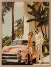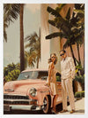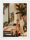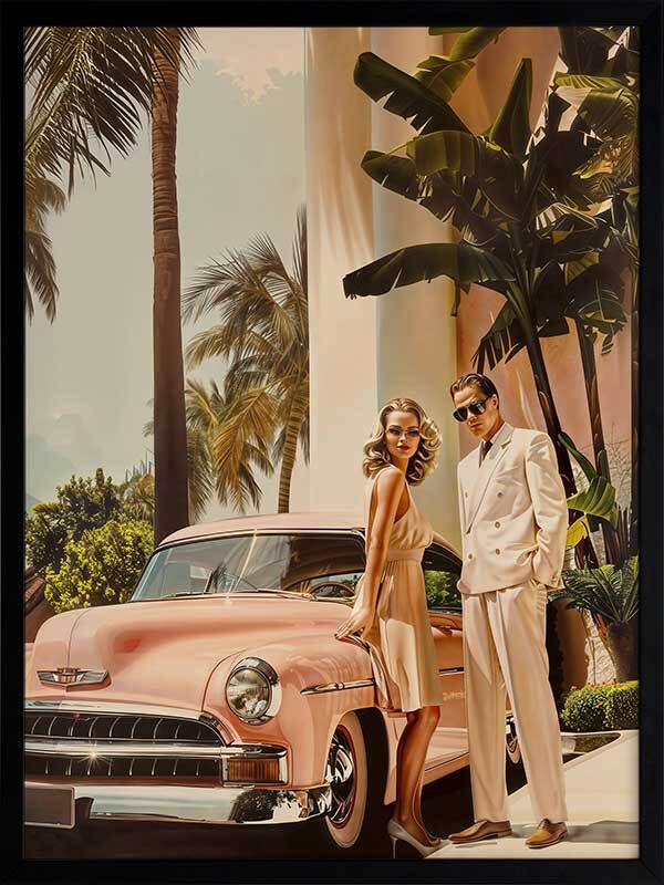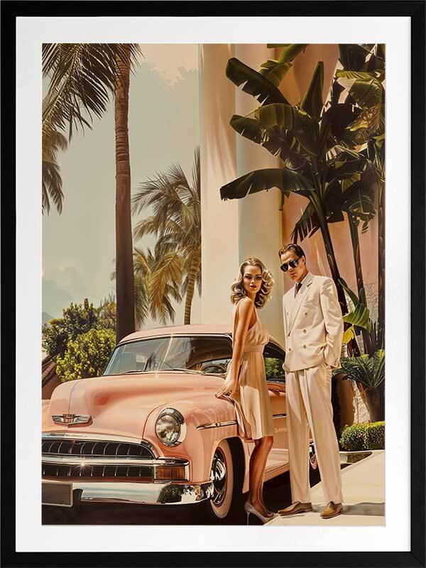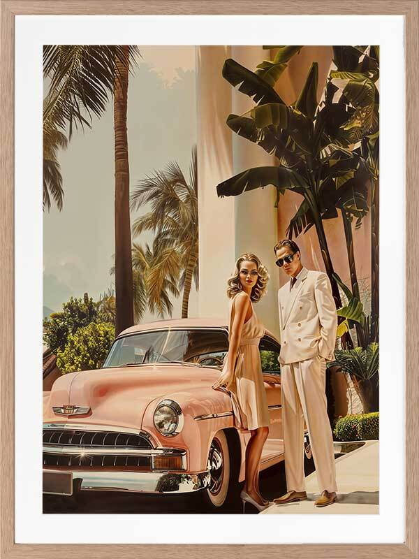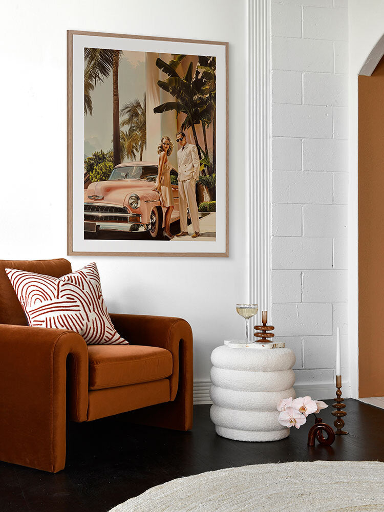 Linen Blush Framed Art Print - Capturing the golden era of architectural-inspired luxury, this art print from interior designer Shaynna Blaze's exclusive collection features a stylish Hollywood couple posed next to a sleek, vintage car, with palm trees swaying behind them. The pastel tones of the classic car and the elegant fashion evoke a timeless allure that's quintessentially 1950s. With its rich colour palette, including blush pinks, soft golds, and vibrant greens, this retro wall art adds an effortlessly chic vibe to any room. It speaks to a glamorous, leisurely lifestyle, making it a perfect fit for those who appreciate the finer things in life. Whether displayed in a living room or bedroom, this limited-edition piece will elevate your home decor, creating an atmosphere of refined elegance and fashionable ease.