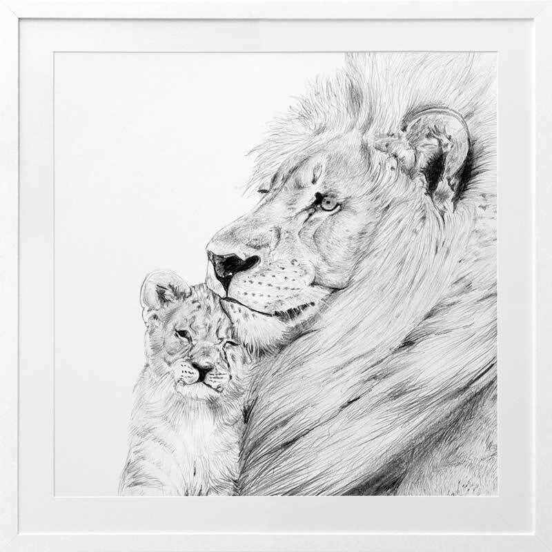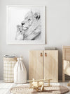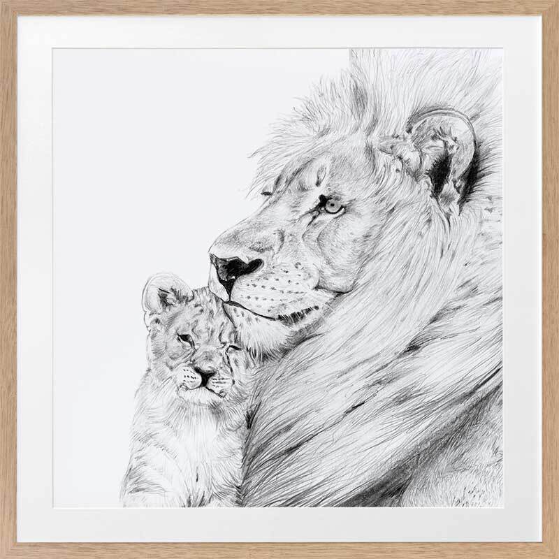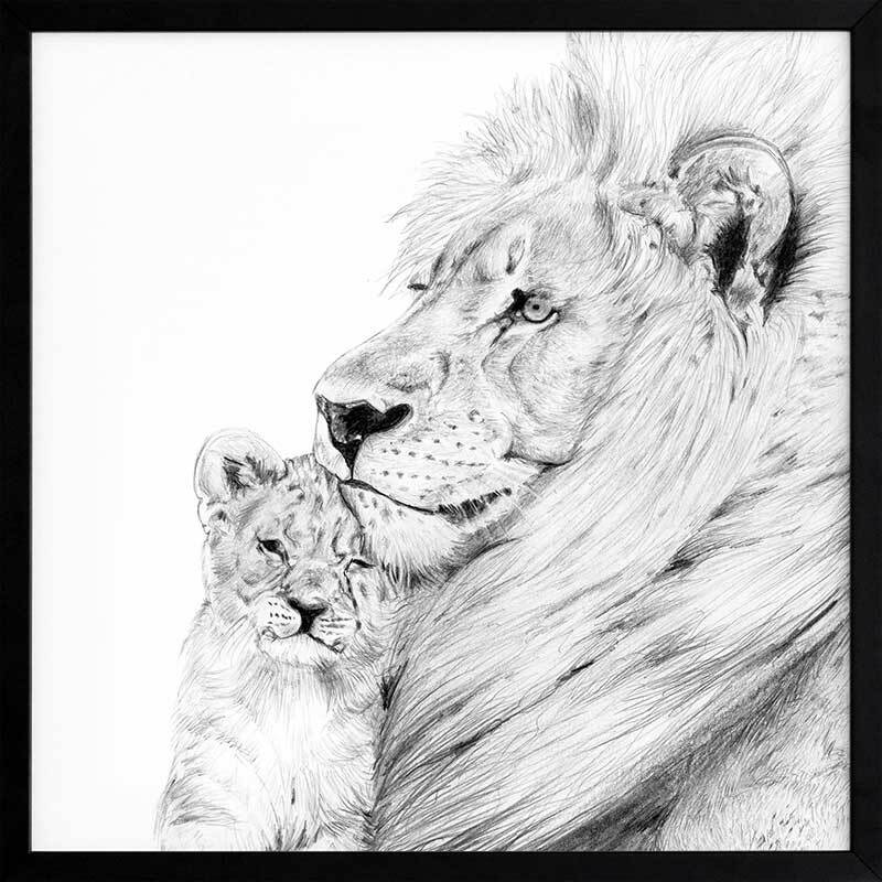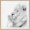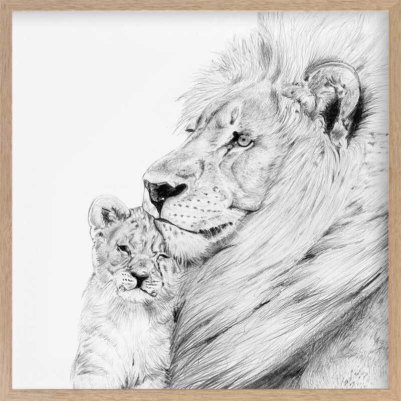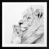Lion Framed Art Print - Take a glimpse into the more intimate side of this powerful creature, with a detailed sketch of a lion and its cub enjoying a gentle moment, nestled in each other's warm embrace. The black, white and grey palette brings a softened energy to this piece, making it a beautiful addition to any space.