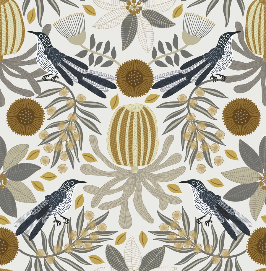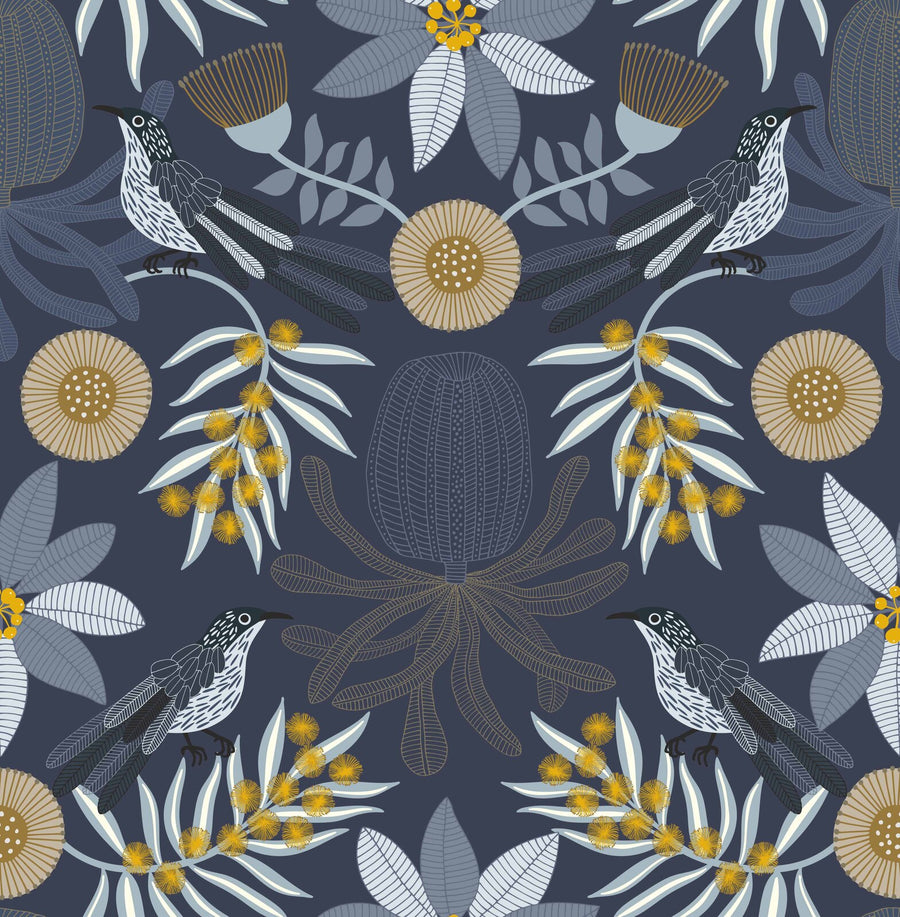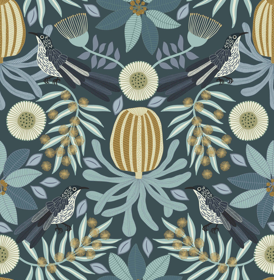 Little Wattlebird Wallpaper - Spot the little wattlebirds exploring each leaf and bud, with their pointy beaks, white bellies, and gorgeous long tail feathers. This statement wallpaper design is a conversation piece, with so many intricate details to discover within each native flower species. Choose from midnight, navy, forest and mustard.