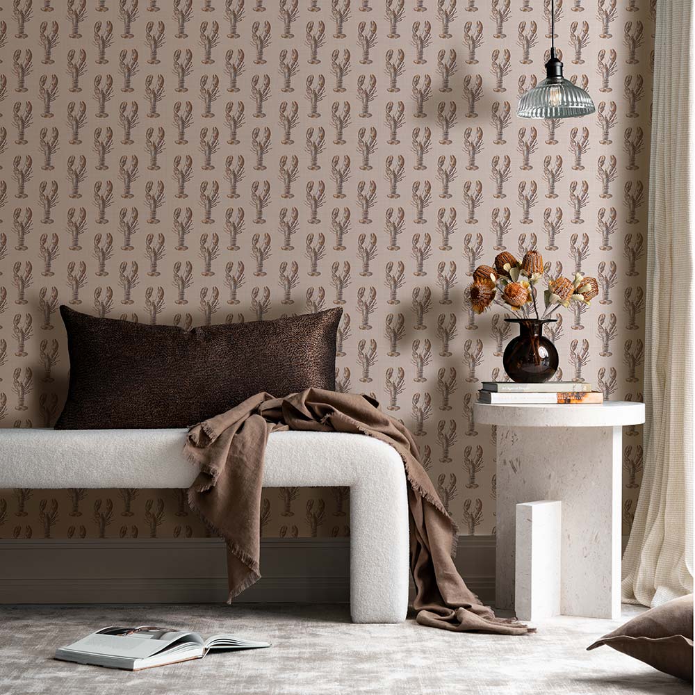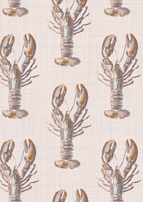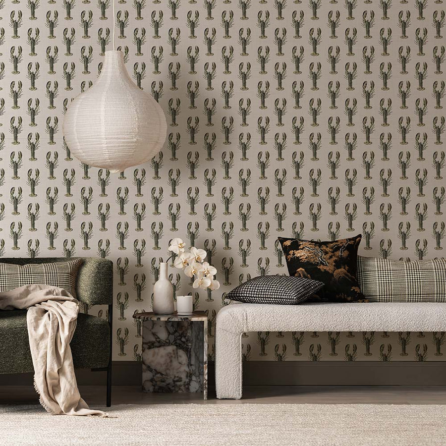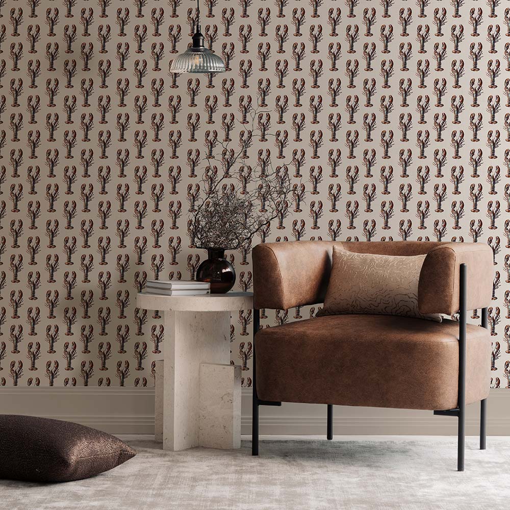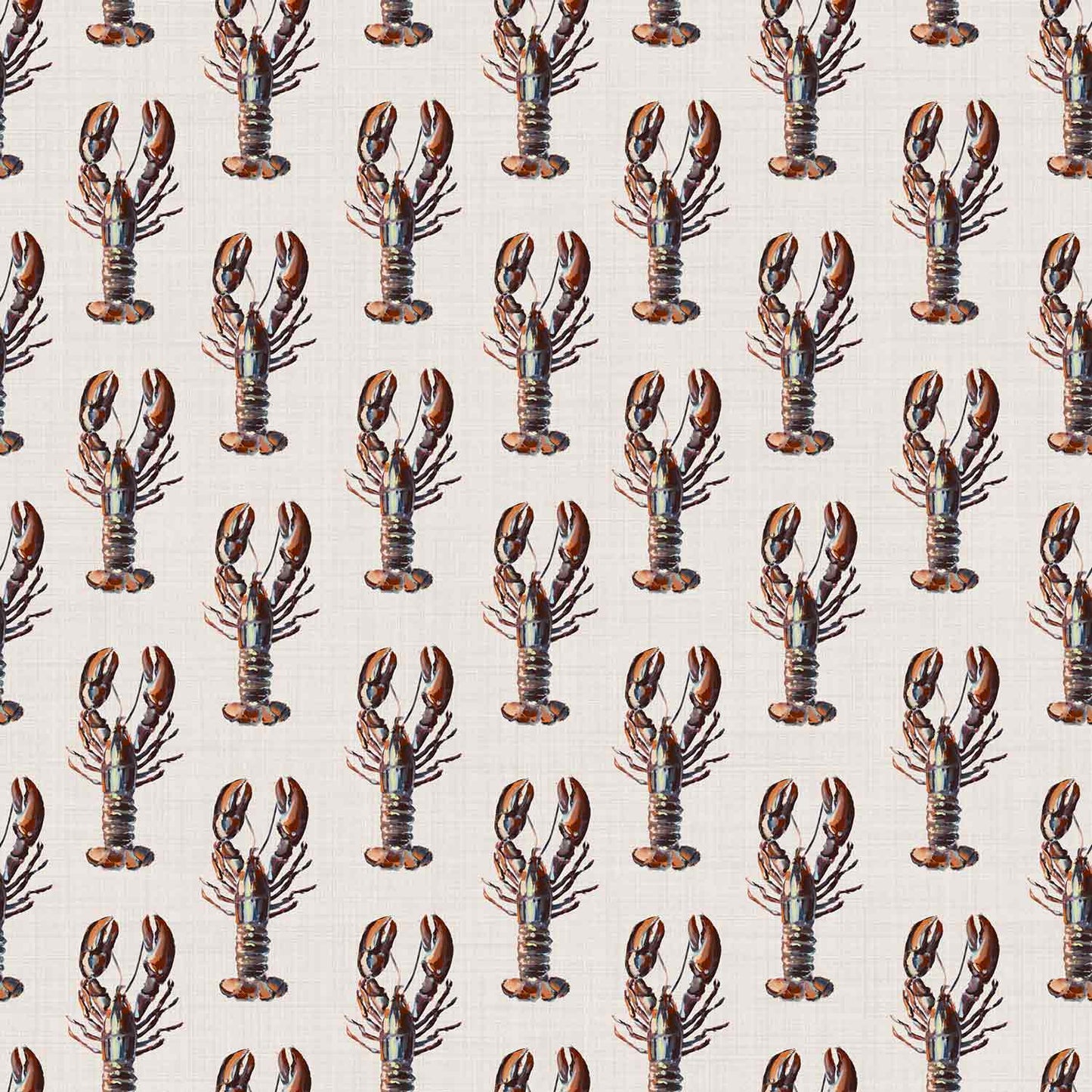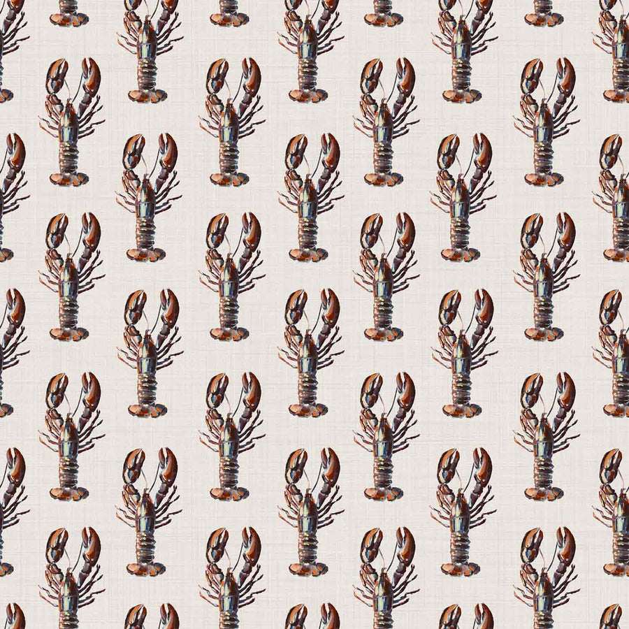 Showcasing intricately illustrated lobsters against a fabric-like background, the symmetrical patterning gives it a timeless, structured feel, making it the perfect patterned wallpaper for those who appreciate bold yet classic design.