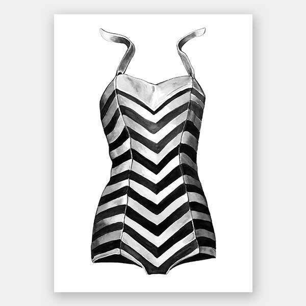 Lola Fine Art Print: A detailed black and white watercolour illustration of a vintage inspired bathing suit. 2017 SPRING/SUMMER COLLECTION: RHAPSODY