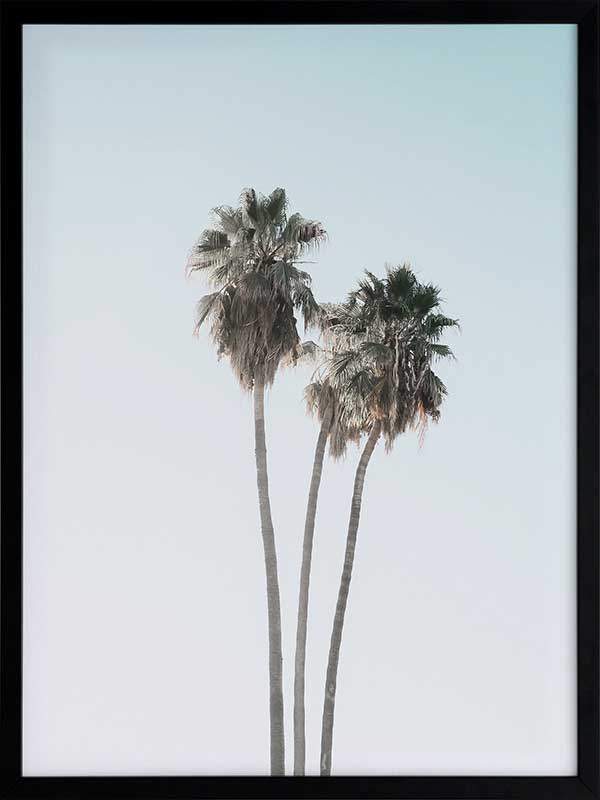 Lone Palms - A cropped photograph of a trio of tall palms against a wide, pastel blue sky. Photographed by Tyler Nix.
