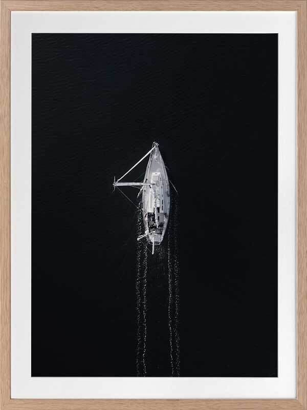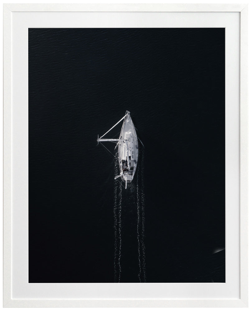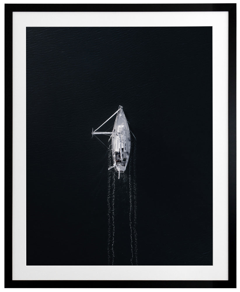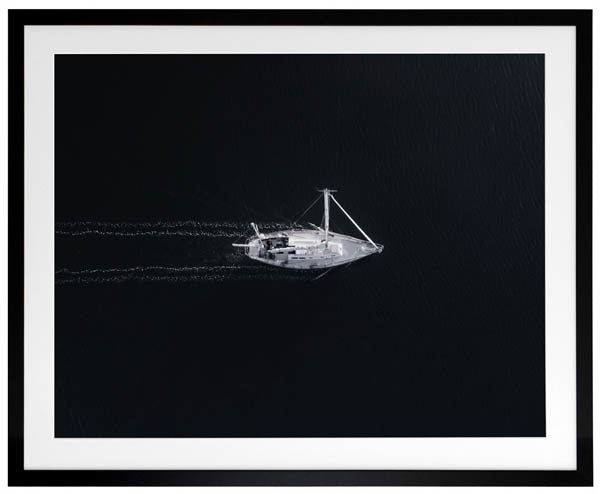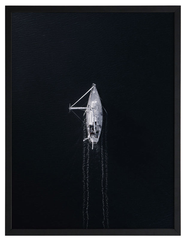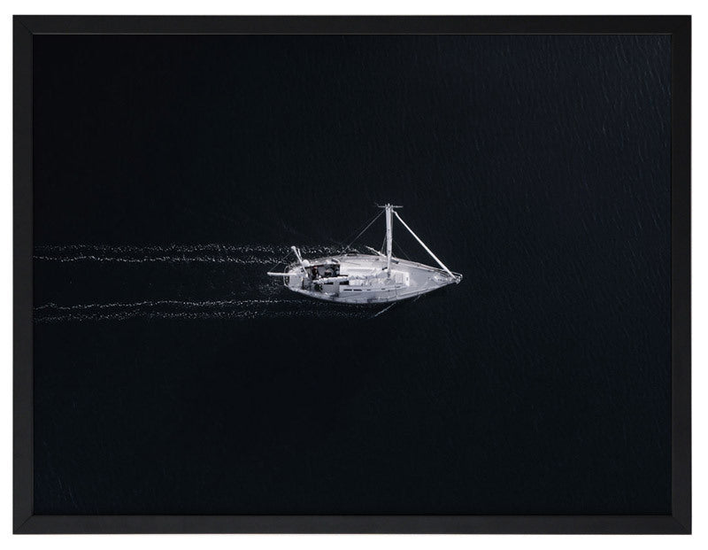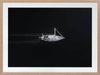 Long Road Home Framed Print: A lone boat carves a trail of gentle ripples into a still and blackened sea. 2016 SPRING/SUMMER COLLECTION: ELEMENT