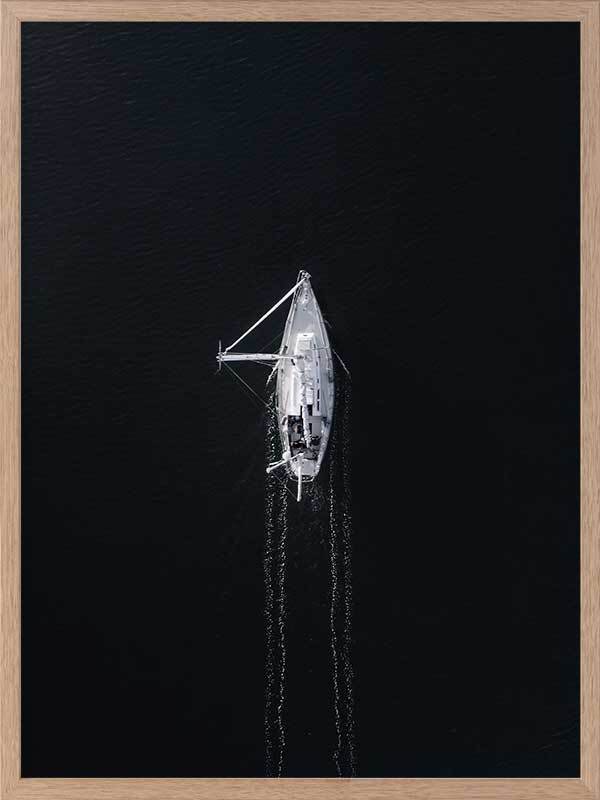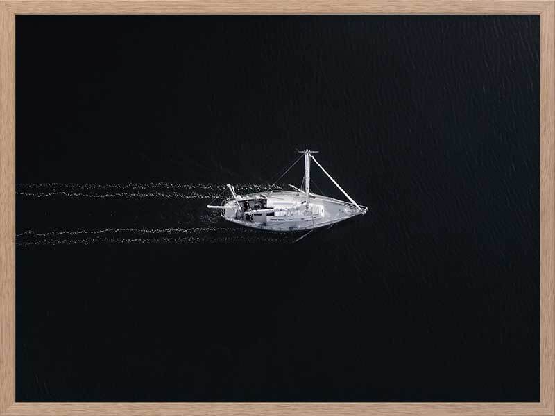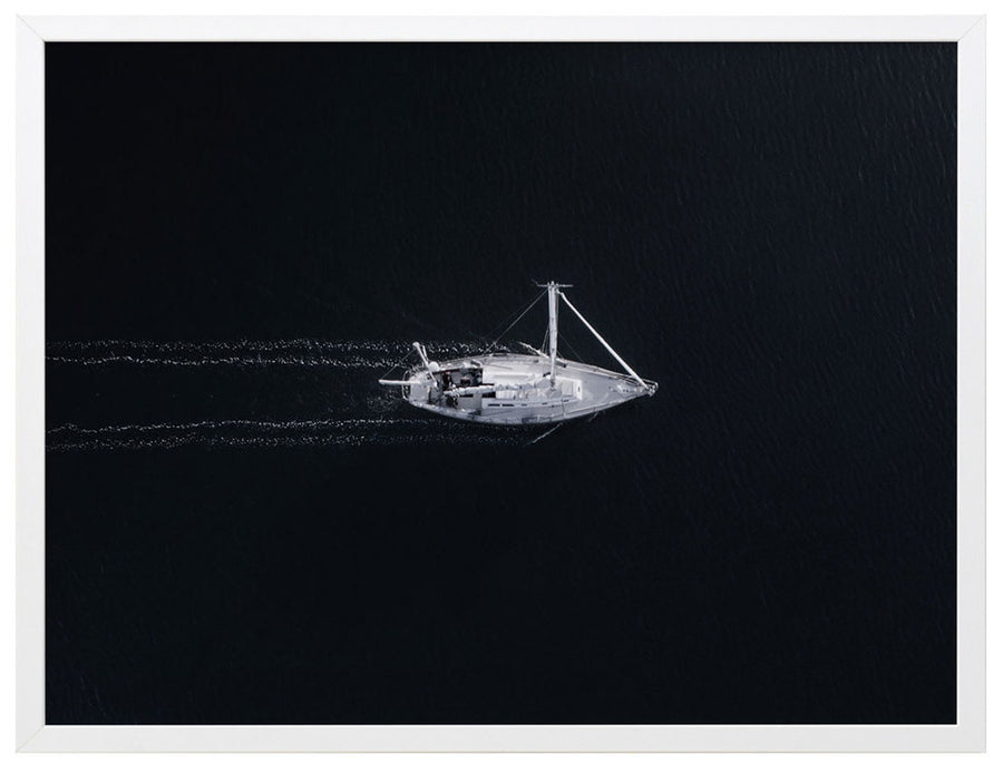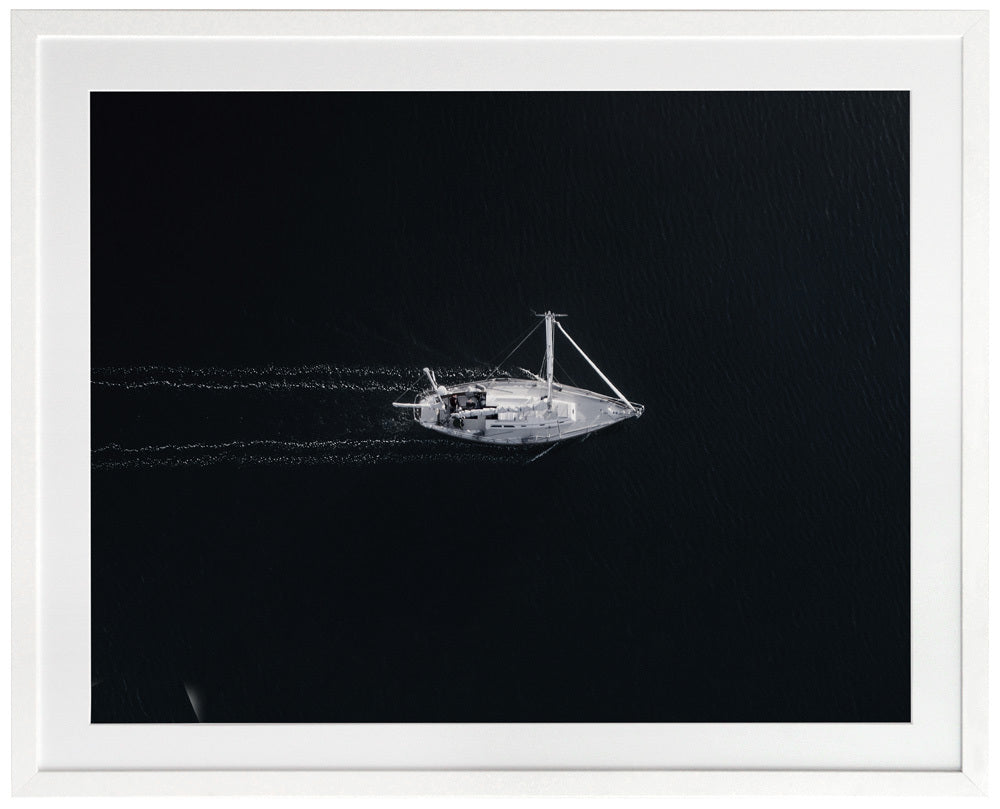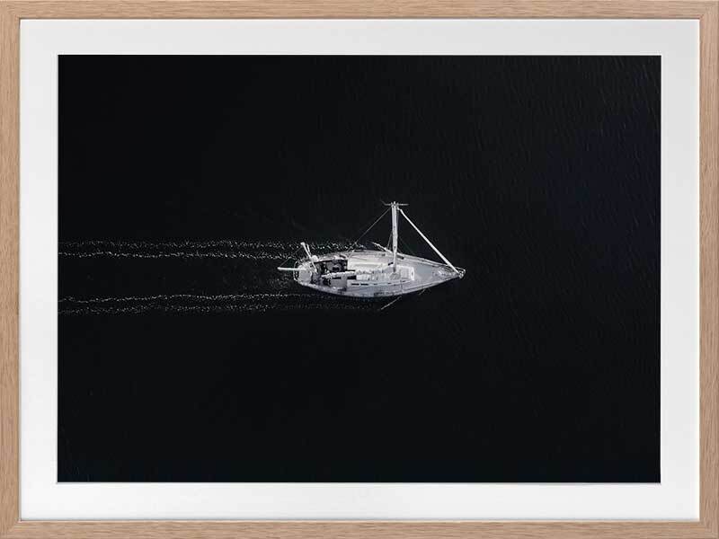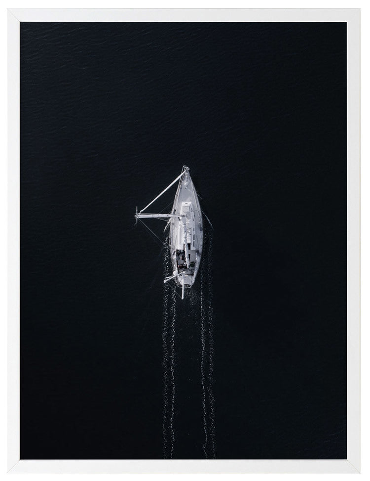 Long Road Home Framed Print: A lone boat carves a trail of gentle ripples into a still and blackened sea. 2016 SPRING/SUMMER COLLECTION: ELEMENT