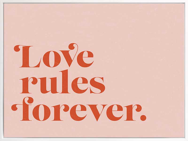 Love Rules - A typographic piece featuring a bold, red font reading 'Love rules forever' against a pink background.