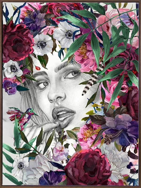 Luna Summer Nights Canvas Art Print - Connect with nature's warm, magnetic energy with this stunning piece, featuring Luna's intense gaze peeking through a burst of multicoloured flora. Perfect for bringing a refreshing vibrancy to your space with rosy reds, blush pinks, rich greens, purple, and hints of soft white shades.