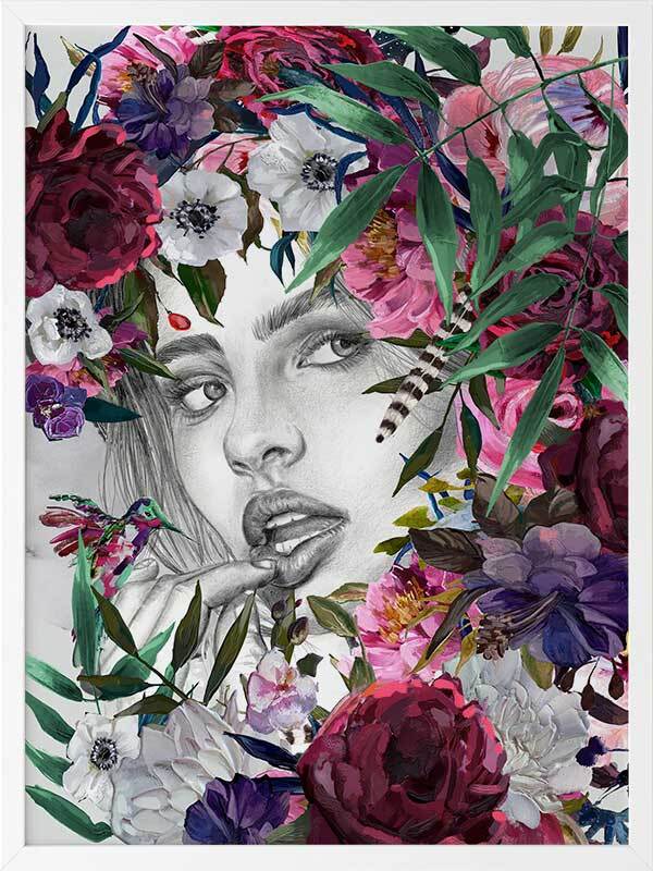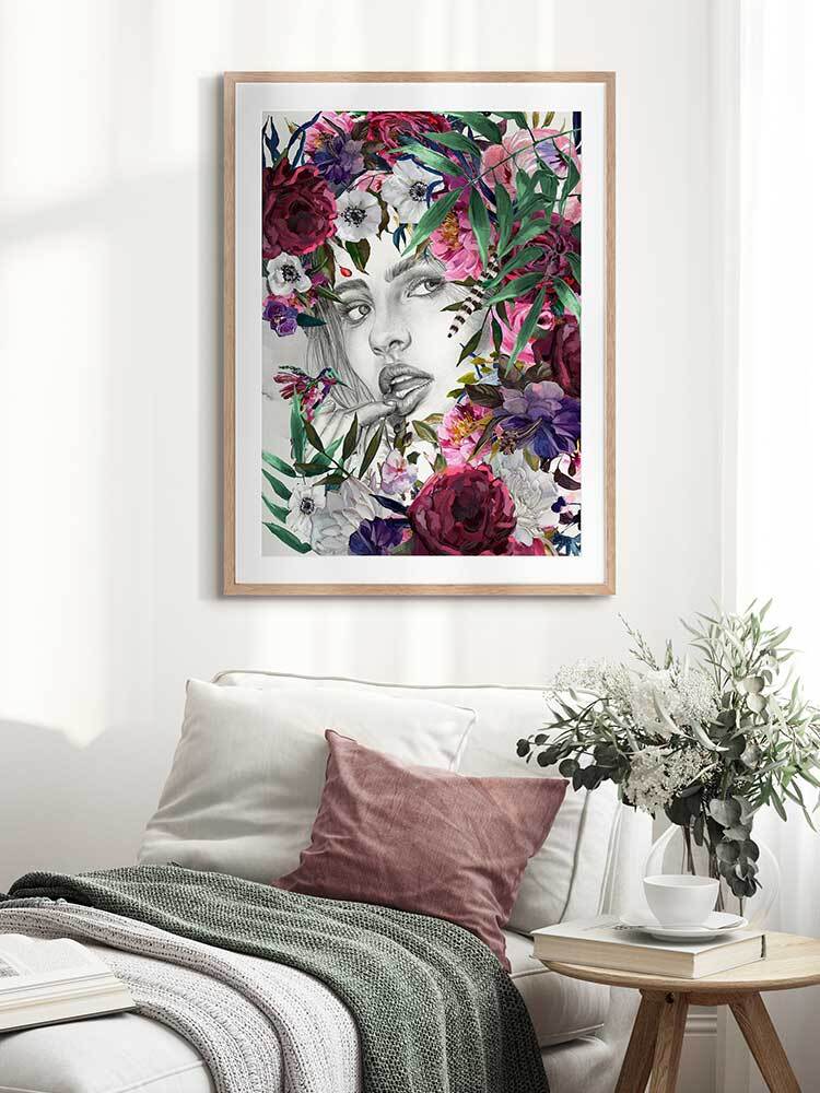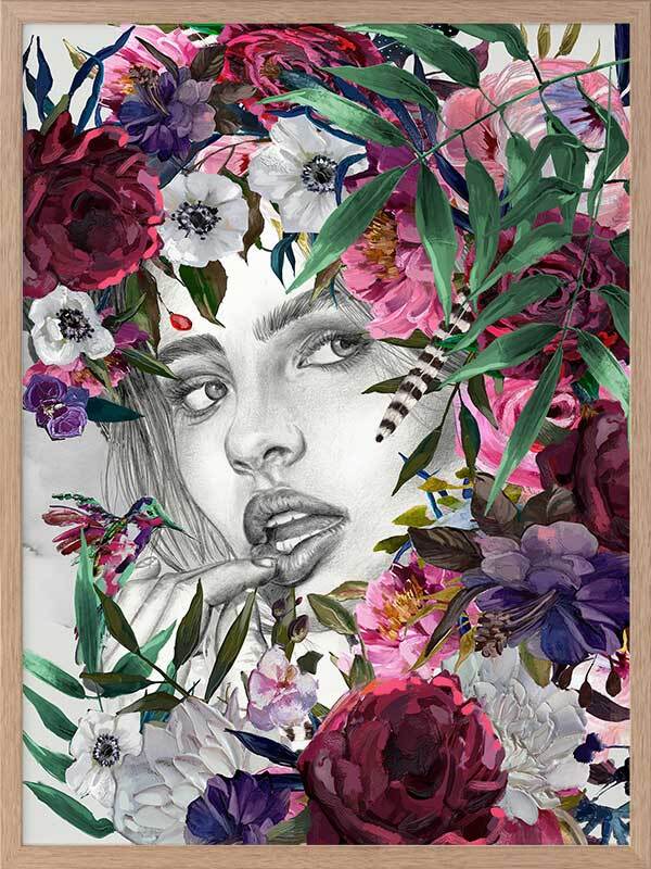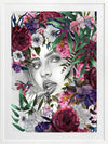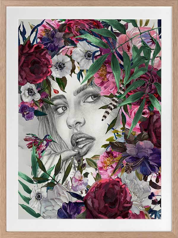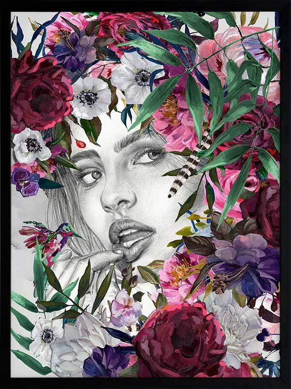 Luna Summer Nights Framed Art Print - Connect with nature's warm, magnetic energy with this stunning piece, featuring Luna's intense gaze peeking through a burst of multicoloured flora. Perfect for bringing a refreshing vibrancy to your space with rosy reds, blush pinks, rich greens, purple, and hints of soft white shades.