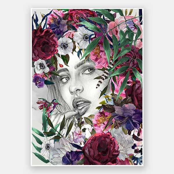 Luna Summer Nights Unframed Art Print - Connect with nature's warm, magnetic energy with this stunning piece, featuring Luna's intense gaze peeking through a burst of multicoloured flora. Perfect for bringing a refreshing vibrancy to your space with rosy reds, blush pinks, rich greens, purple, and hints of soft white shades.