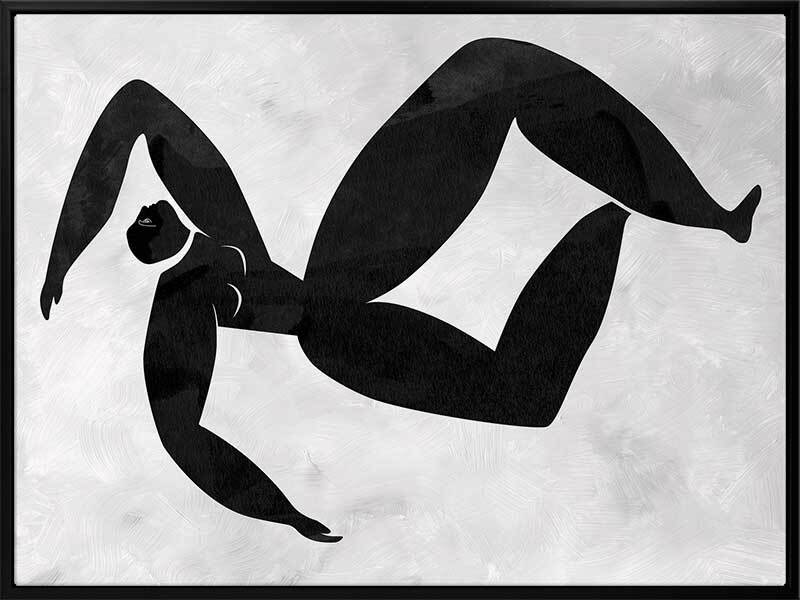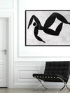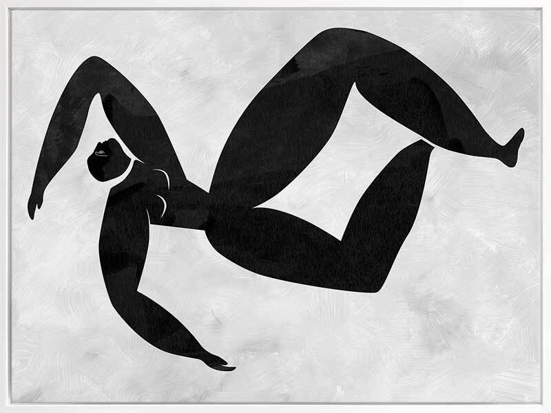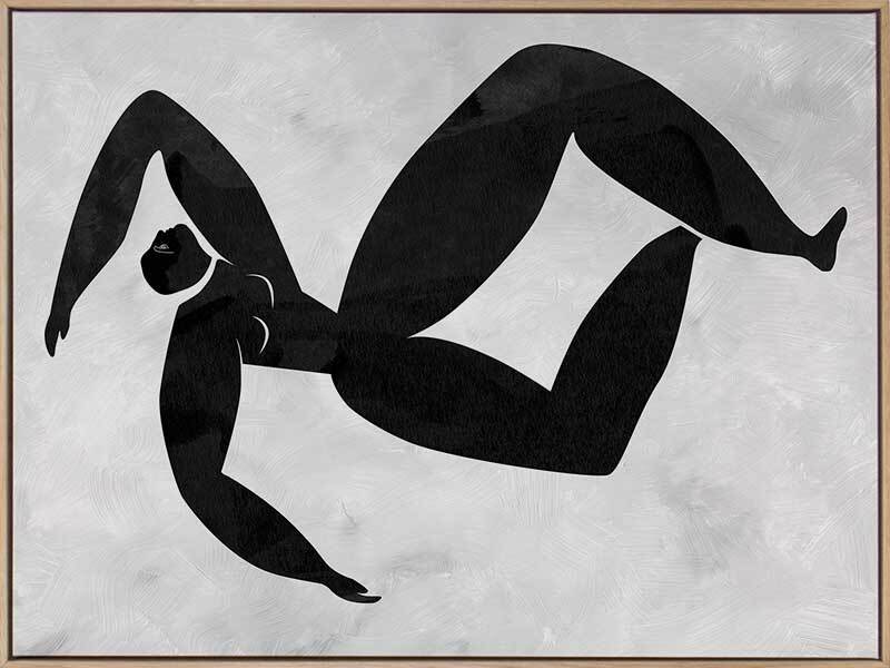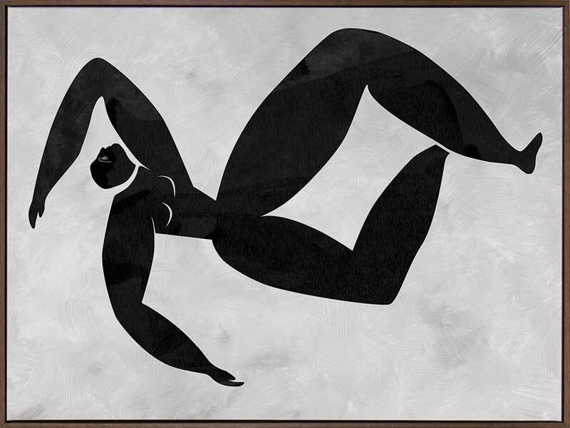 Lydia Cut-Out III Canvas Art Print - Drawing inspiration from the iconic cut-out style artwork from modern art master Matisse, this artwork features a simplistic, caricature-like portrait of a figure with exaggerated limbs. The colour palette is bold and monochromatic, featuring a black coloured figure against a light grey textured background. This artwork has been created to match with Lydia Cut-Out I, II and IV.