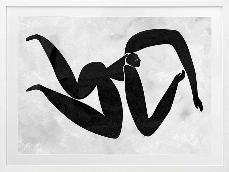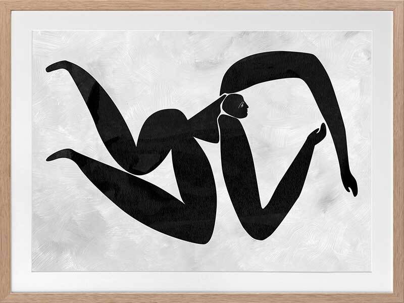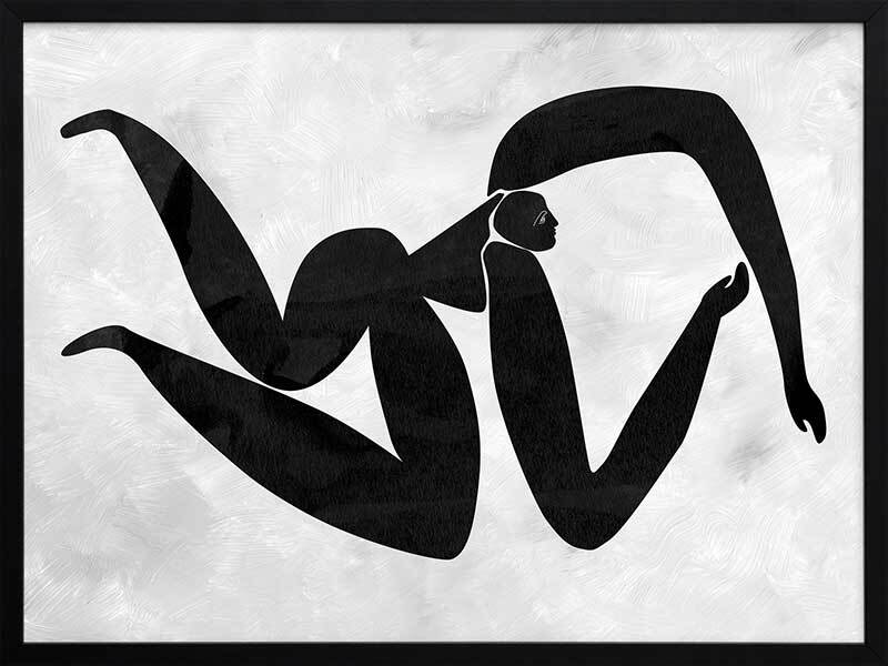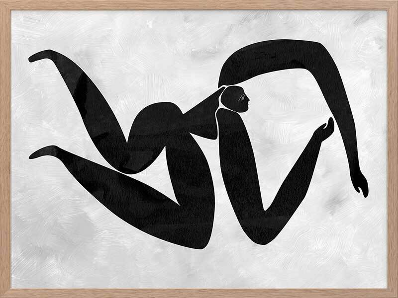 Lydia Cut-Out IV Framed Art Print - Drawing inspiration from the iconic cut-out style artwork from modern art master Matisse, this artwork features a simplistic, caricature-like portrait of a figure with exaggerated limbs. The colour palette is bold and monochromatic, featuring a black coloured figure against a light grey textured background. This artwork has been created to match with Lydia Cut-Out I, II and III.