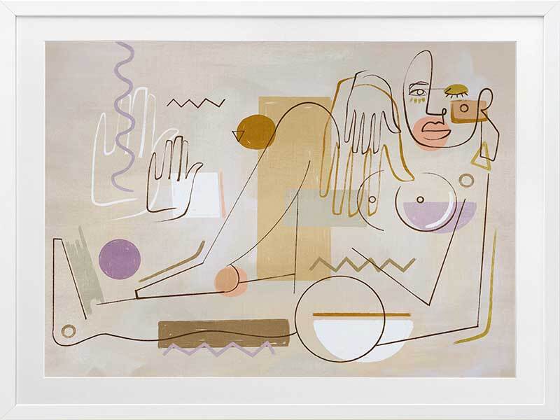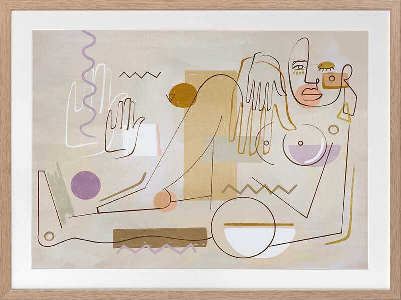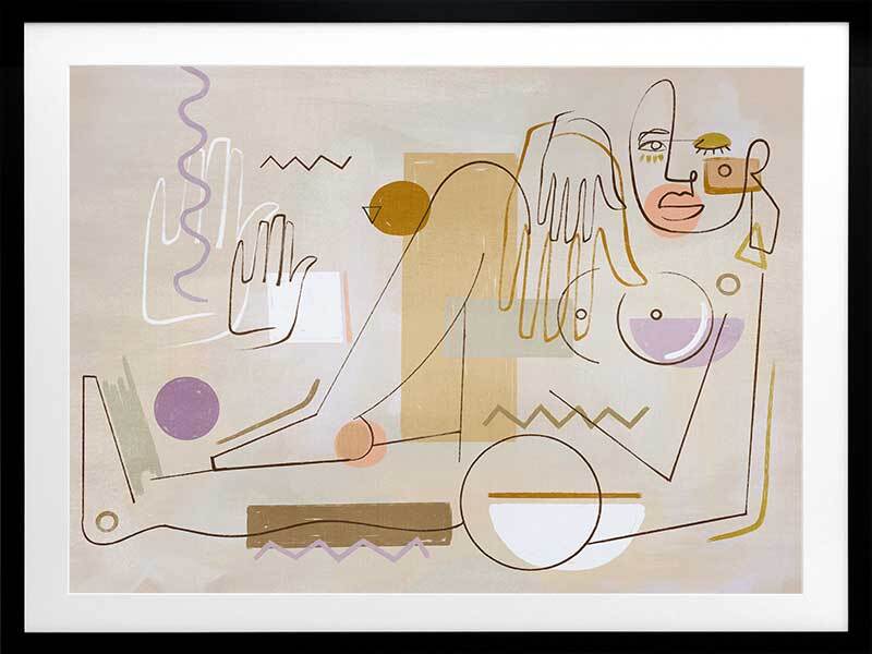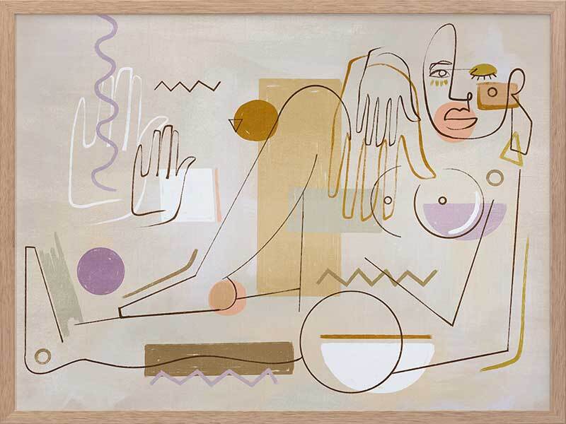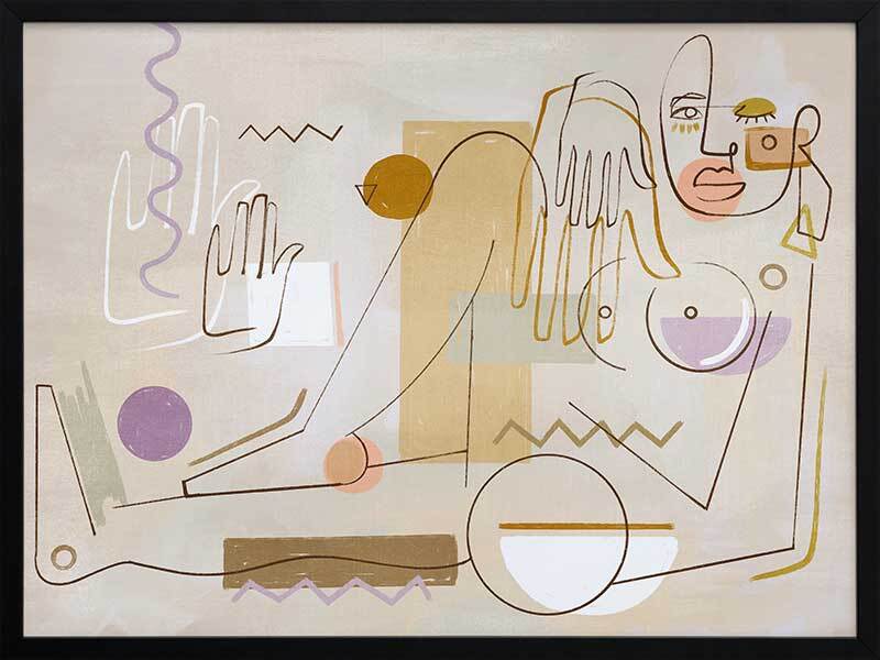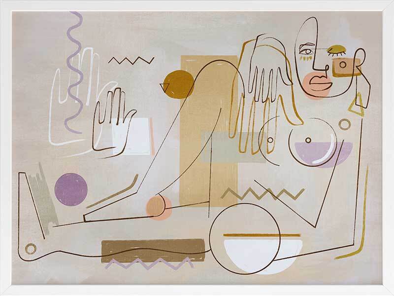 Ma Belle Framed Art Print - "Ma Belle" - My Beautiful. Deconstruct the way you look at the world with this unique perspective of a female figure, posed comfortably in her element. Using fragmented shapes and lines, with unfinished details for a relaxed look, this abstract piece brings a sense of movement with its expressive design. A fairly neutral palette of sandy beige, golden yellow and warm brown are juxtaposed with lilac purple and a hint of sage green, making this piece the perfect balance between colourful and neutral to suit any interior style.