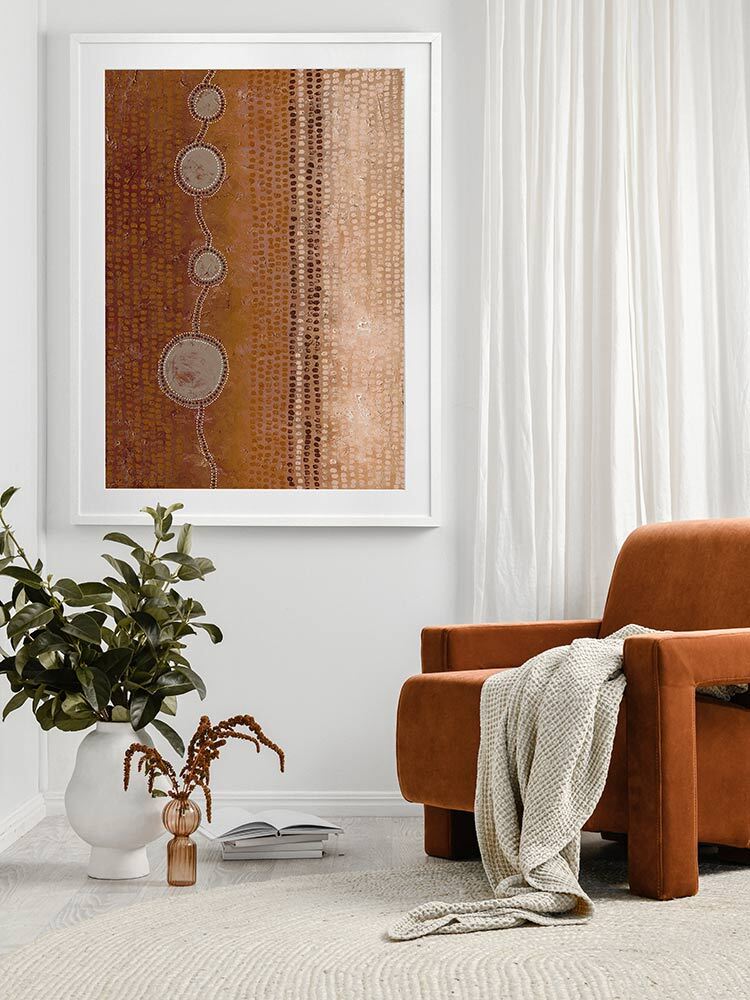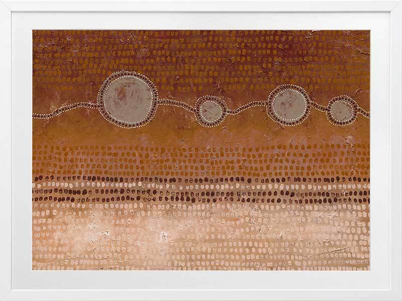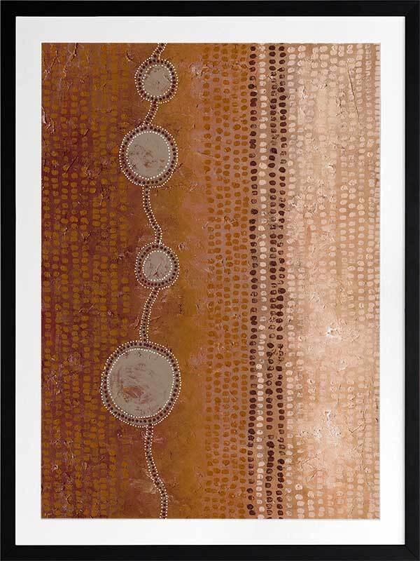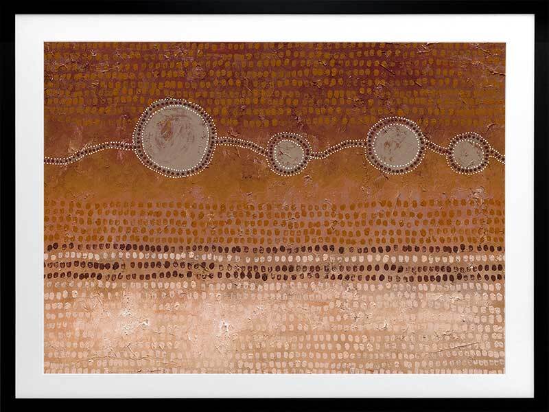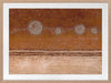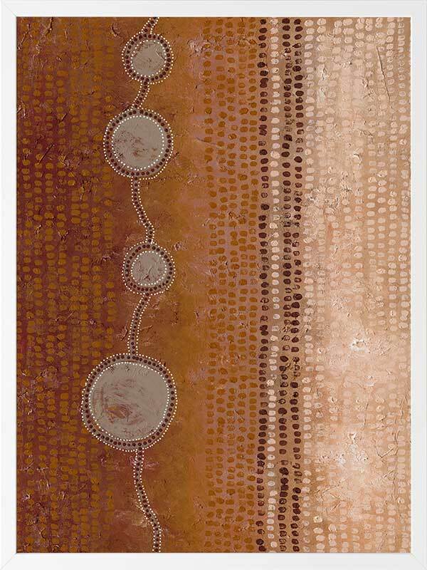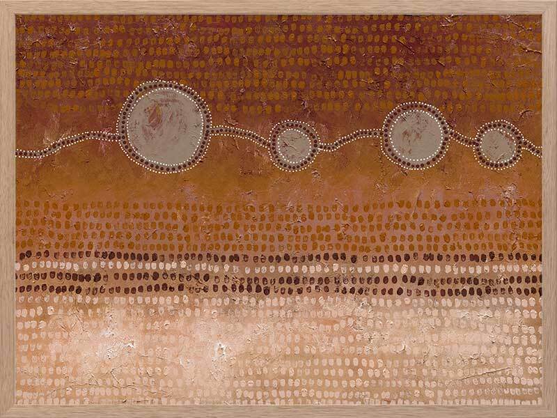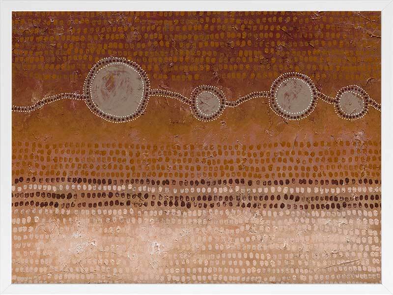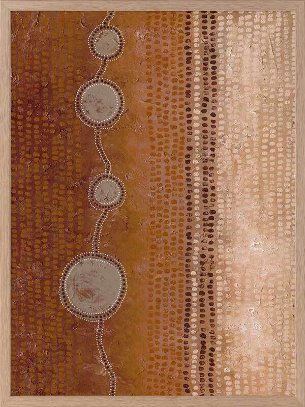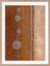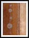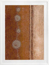 Mabinya Framed Art Print - Mabinya - "Wait or Stop". Simple, yet intricate, this artwork makes an understated statement with meticulous lines of traditional dot painting, with a unique circular pattern flowing through from one end of the canvas to the other. A neutral palette of warm beige shades with orange undertones means this piece easily pairs with any interior style.
