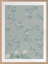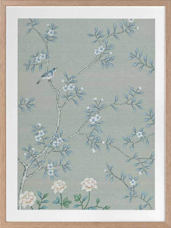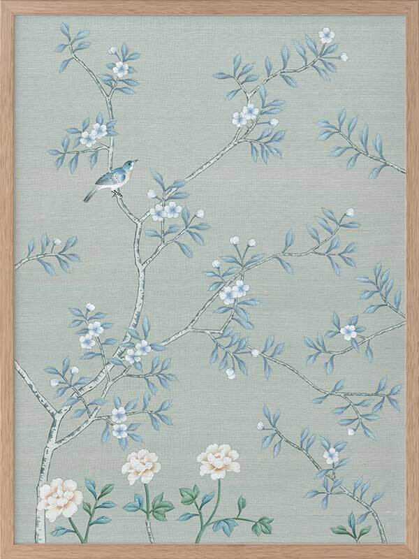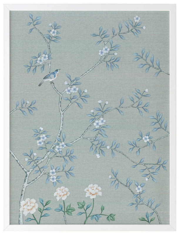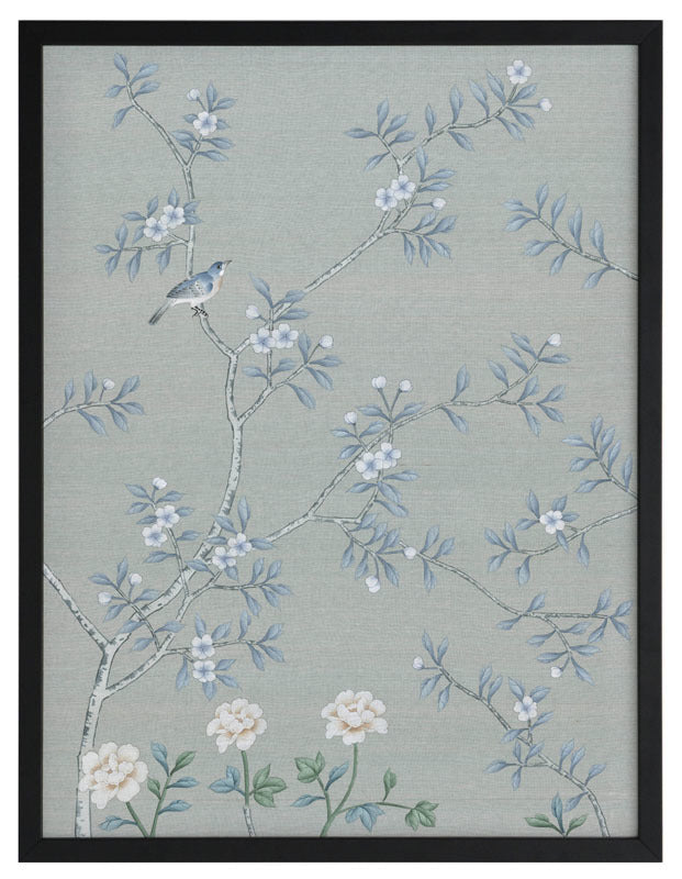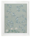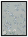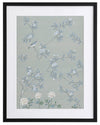 Magnolia II Framed Print: Part two of a soft, cornflower blue mural piece featuring an intricate magnolia tree in bloom. Small birds feature throughout. Designed to be displayed as a triptych with Magnolia I & III. 2018 AUTUMN/WINTER COLLECTION: CONTINUUM