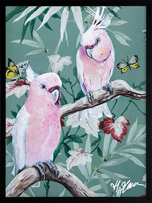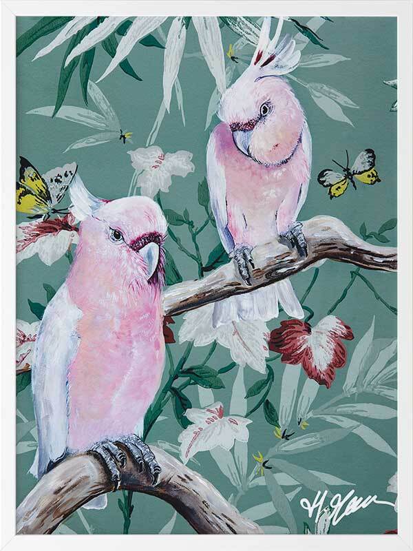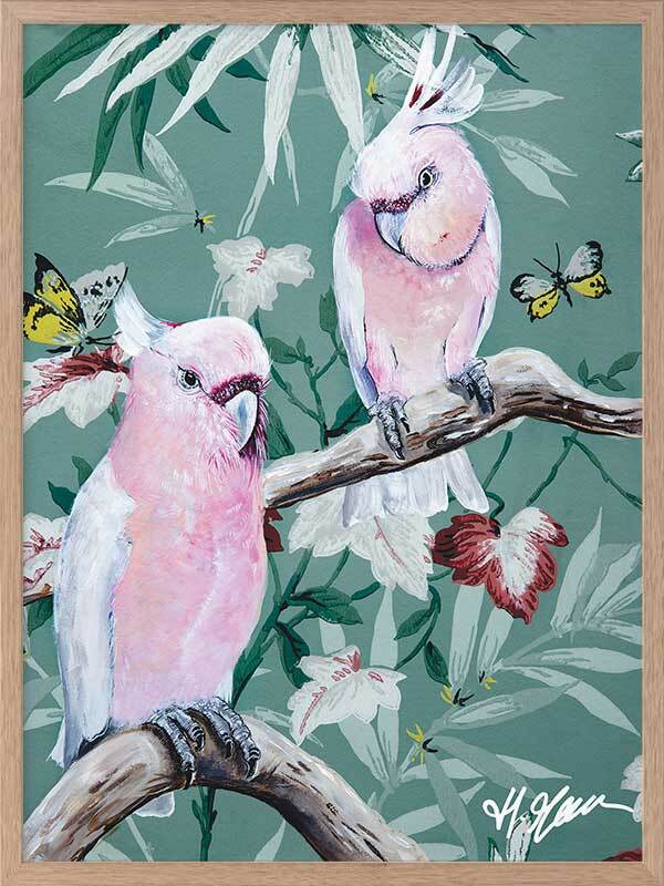 Major Mitchells Framed Art Print - A pair of Major Mitchells sit relaxed on their own separate branch, surrounded by floating butterflies and swaying leaves. With its lively palette of fern green, soft pink, and pops of yellow and red, this vintage-inspired study of Australia's native flora and fauna will suit most interior design styles.