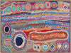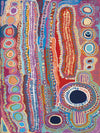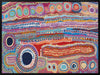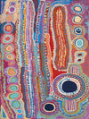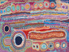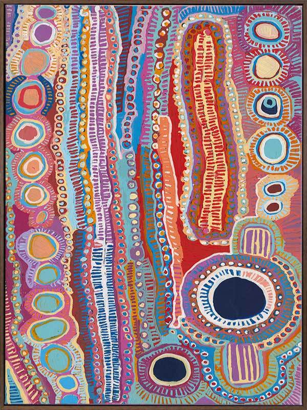 Malikijarra Jukurrpa Canvas Art Print - Using vibrant colours, playful shapes and hundreds of meticulously placed lines and layers, this breathtaking Indigenous Aboriginal artwork tells the sacred story of the two dogs Dreaming. The colour palette is a kaleidoscope of pin, red, orange, blue and purple.