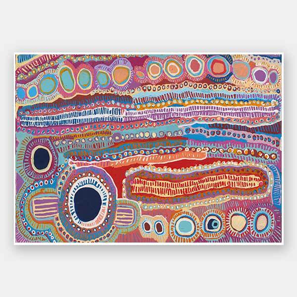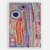 Malikijarra Jukurrpa Unframed Art Print - Using vibrant colours, playful shapes and hundreds of meticulously placed lines and layers, this breathtaking Indigenous Aboriginal artwork tells the sacred story of the two dogs Dreaming. The colour palette is a kaleidoscope of pin, red, orange, blue and purple.