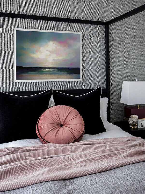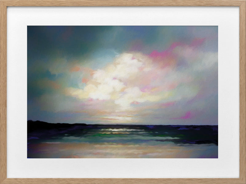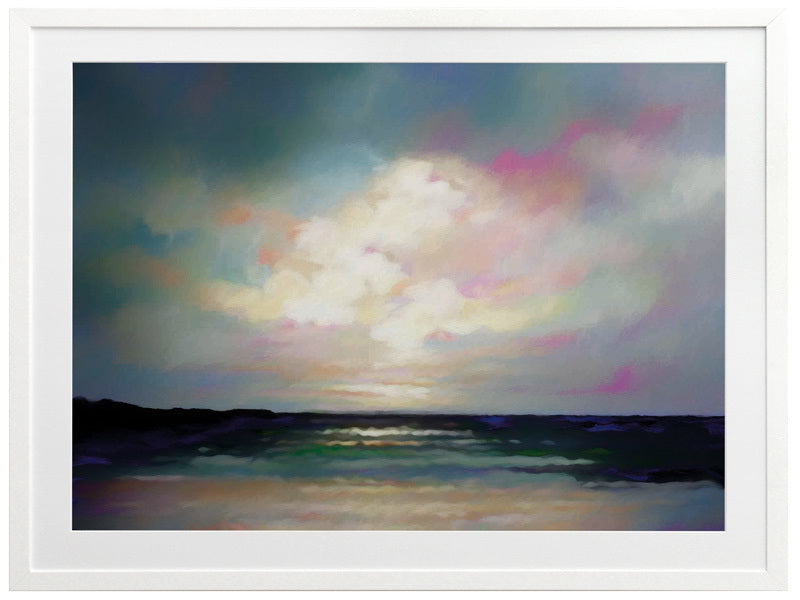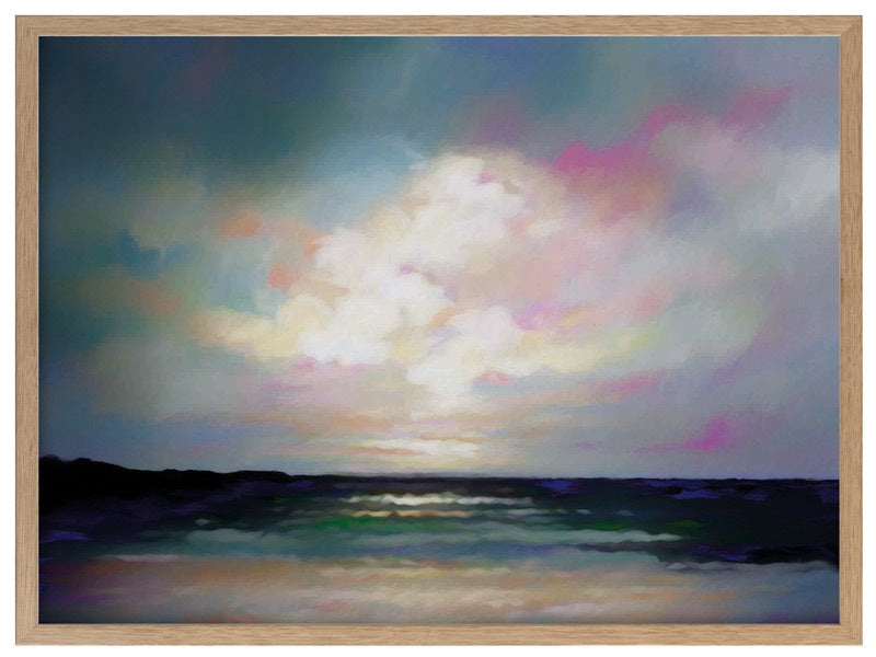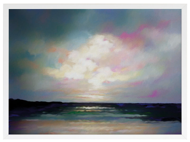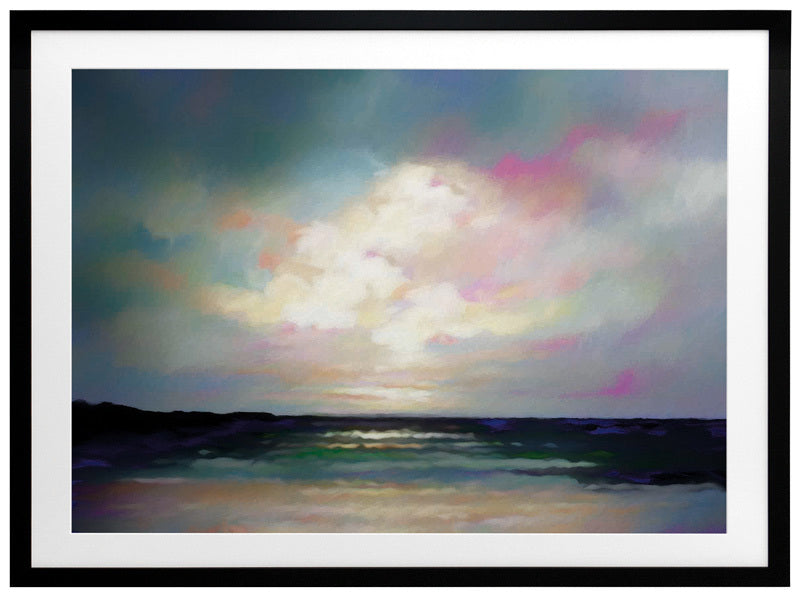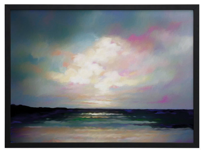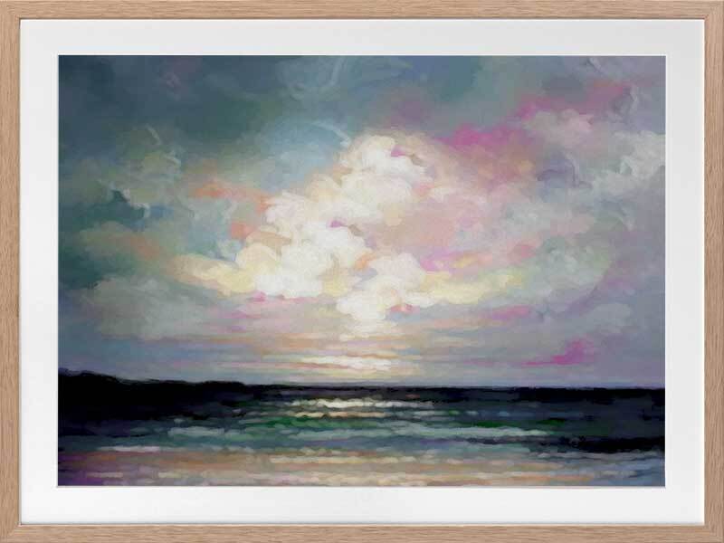 Mandalay Beach Framed Print: A beautifully vibrant art print of an oil-painted seascape featuring a soft, pink and lavender sky above a soft seashore. 2018 SPRING/SUMMER COLLECTION: REMINISCE