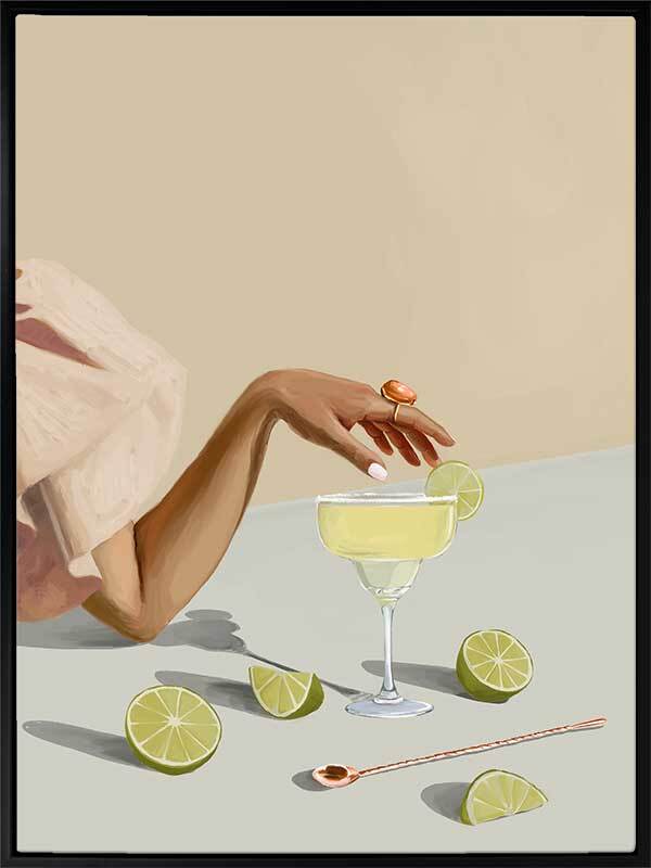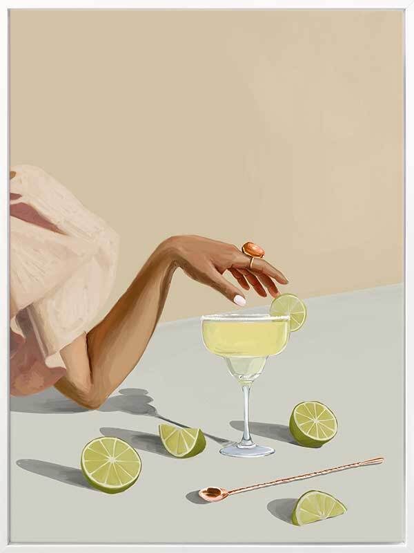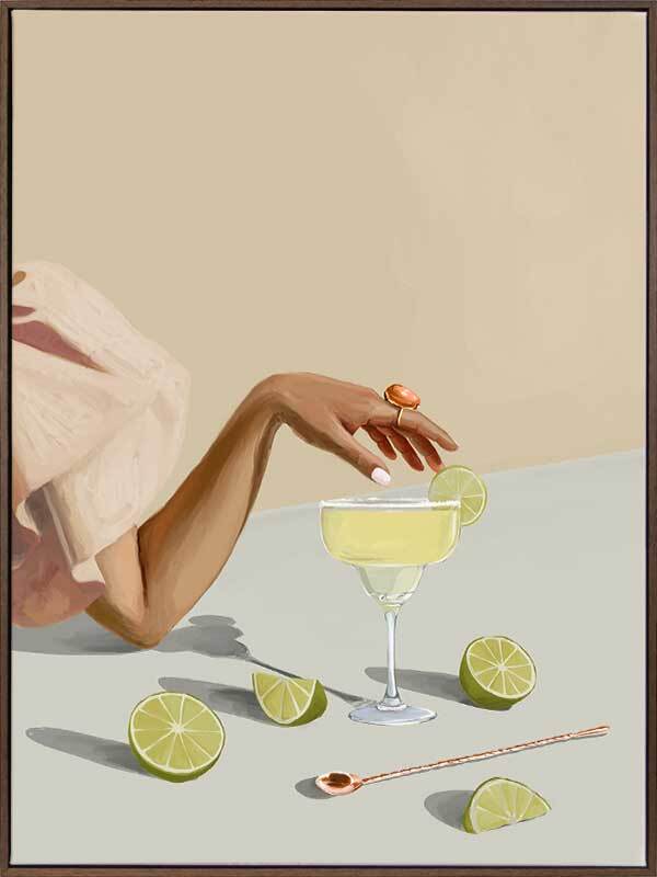 Margarita Canvas Art Print - There's nothing quite like that first sip of a refreshing Margarita. Bring a breath of fresh air to your space with this modern art print that exudes playful elegance. As the woman reaches for the glass, giving a peek of her flowy pink dress, you're reminded to take a break and give yourself time to relax. Palette includes soft beige, pink, and green tones.