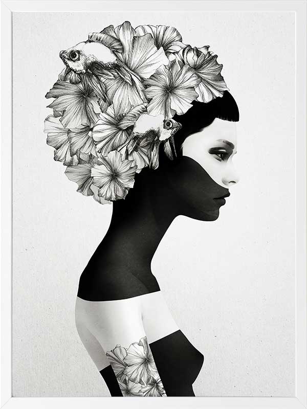 Jenny Liz Rome - Artist Collection Marianna - A quirky mixed media piece in collaboration with Ruben Ireland. Featuring the silhouette of a woman with a hat made from flowers and fish. Introducing our stunning artist collection by the incredibly talented Jenny Liz Rome. Based in Canada, Jenny Liz Rome specialises in fantasy portraiture, combining different forms of media and exploring themes of femininity and the wild.