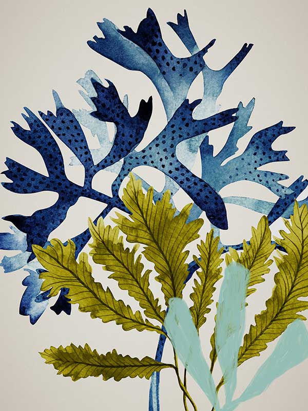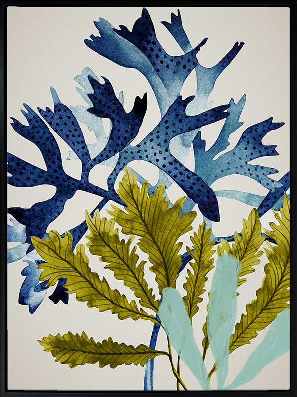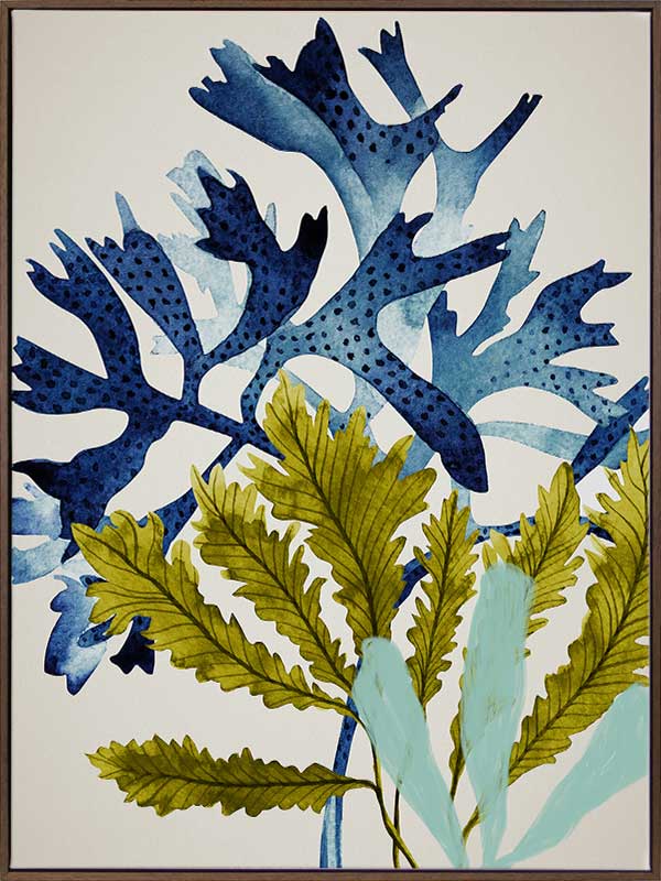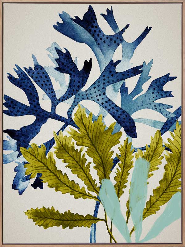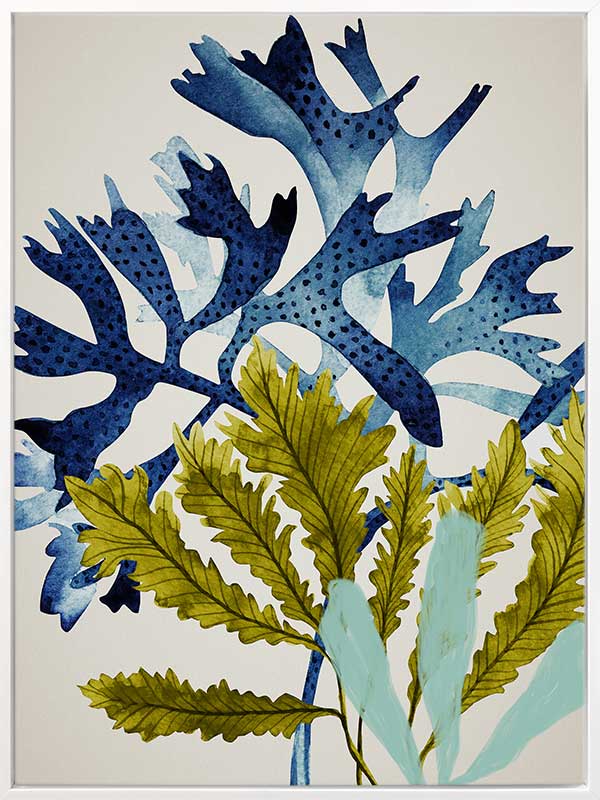 Marion Reef - A Hampton's inspired artwork featuring overlapping watercolour painted coral in shades of green and blue on a beige background.