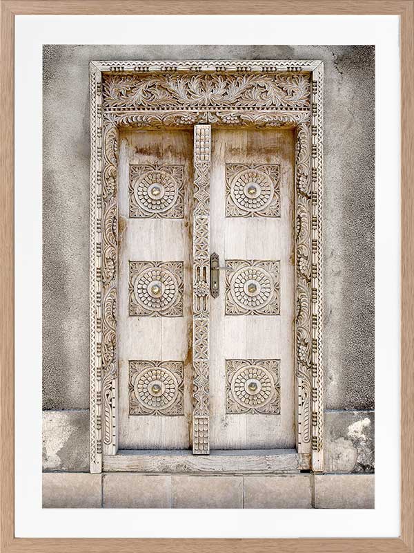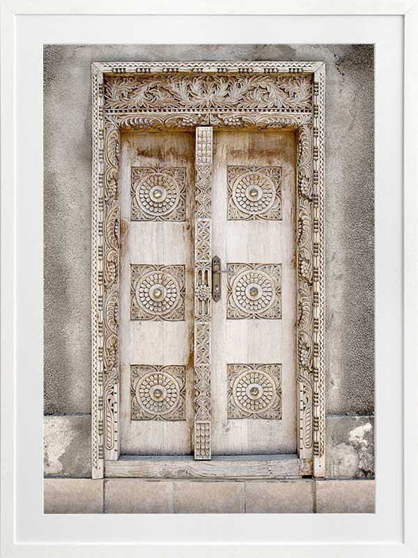 Marrakech Door - A subtle yet striking photograph of an ornately carved Moroccan wooden door set in a textured beige wall.