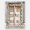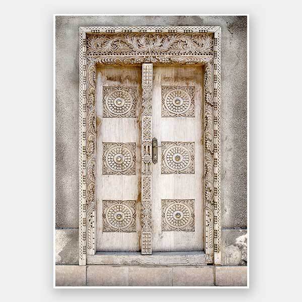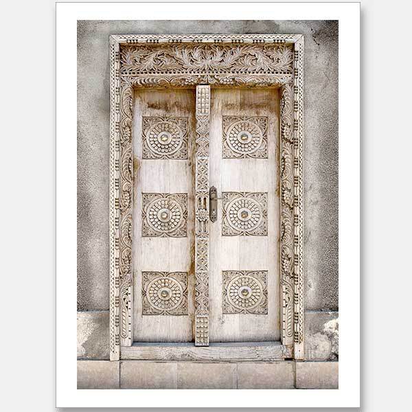 Marrakech Door - A subtle yet striking photograph of an ornately carved Moroccan wooden door set in a textured beige wall.