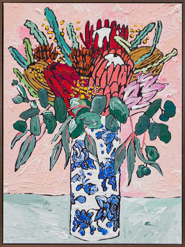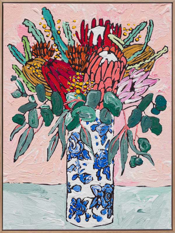 Matisse Flowers - This poster print has red, peach and orange Matisse flowers in a blue and white rose patterned vase that sits on a soft green tablecloth against a soft pink background. This vibrant still life poster was created with acrylic paint with thick brush strokes inspired by Matisse. Lara Meintjes is a US-based, South African painter who isn't afraid to experiment mixing bold colours with soft floral imagery. The depth of creativity in her pieces inspires you to find the calm within the chaos.