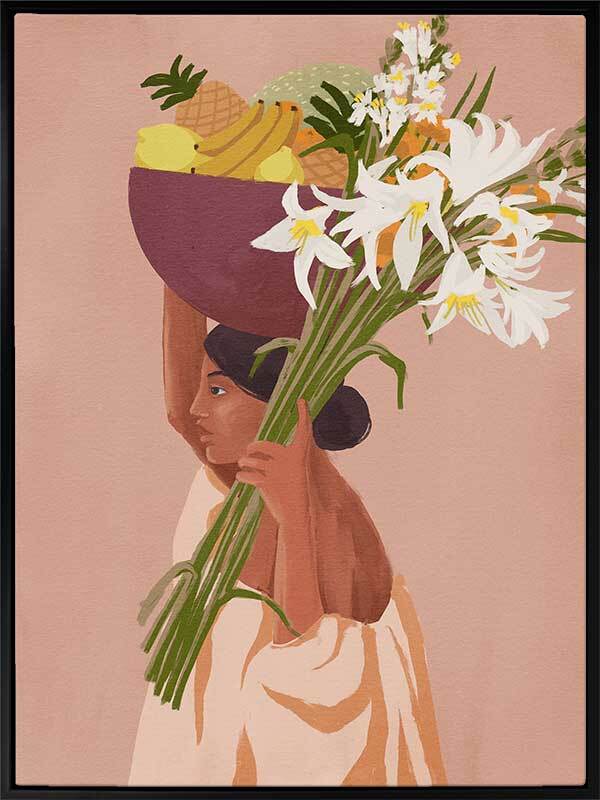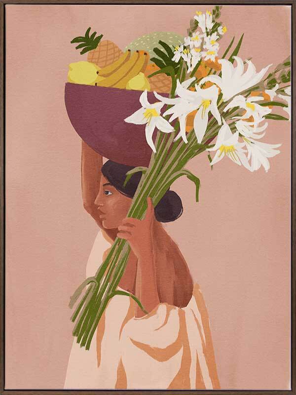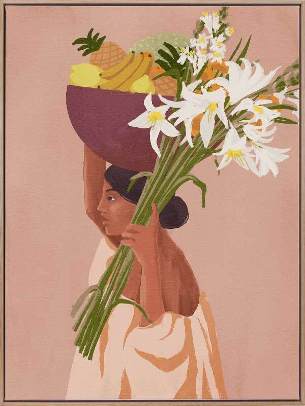 Mercado del sol Canvas Art Print - After a long day selling her fresh fruits and flowers at the local market, she makes her way back home, basking in the warm, orange light of the setting sun, feeling the gentle breeze billow on her favourite orange dress. A gorgeous statement piece to brighten any room, a warm palette of pink-toned clay, brown, yellow, green, purple and white shades makes this piece easy to incorporate with other interior styles.