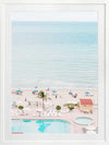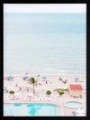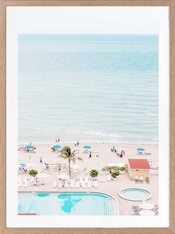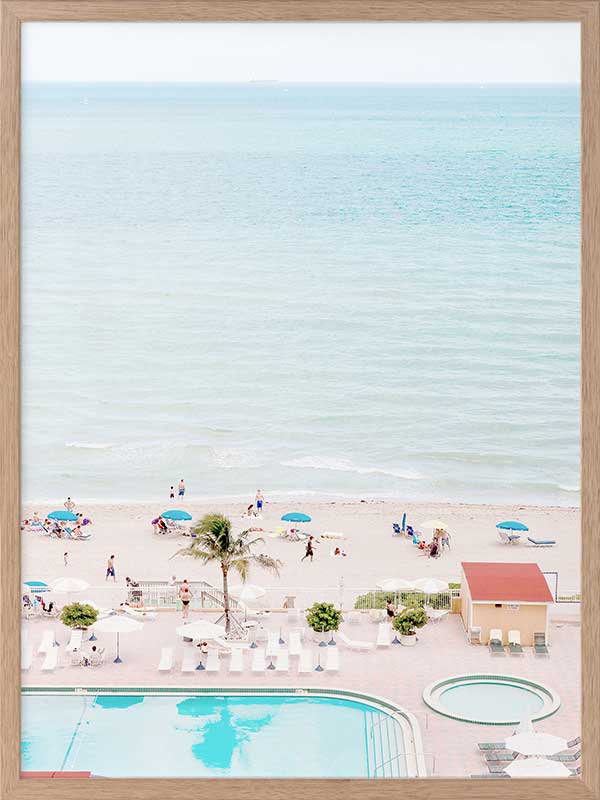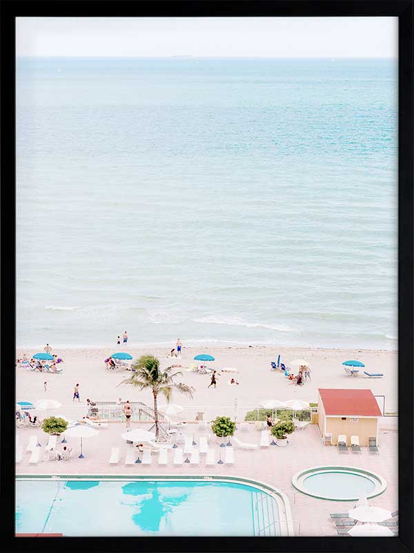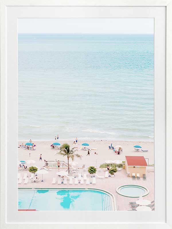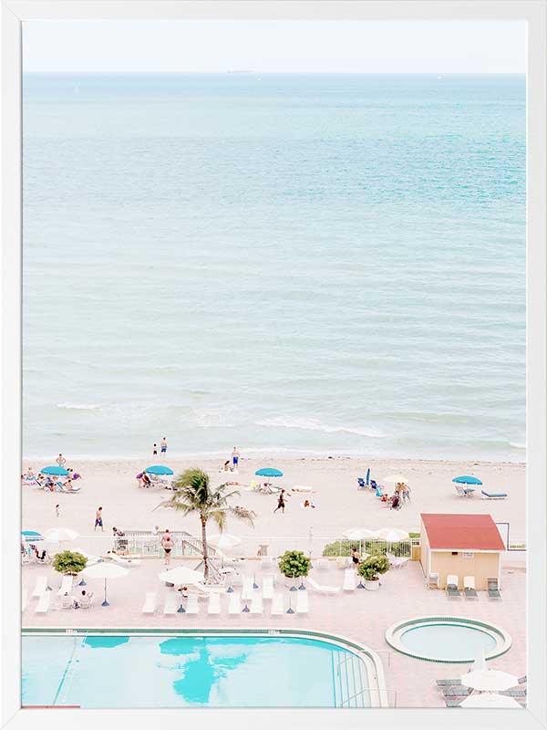 Miami Poolside Poster Print. Put that dream vacation to Miami in your space to inspire you. The bright blue skies and lavish beach chairs beside the inviting pool makes you feel relaxed just by looking at it. Dive into submission and adorn your space with this timeless piece.