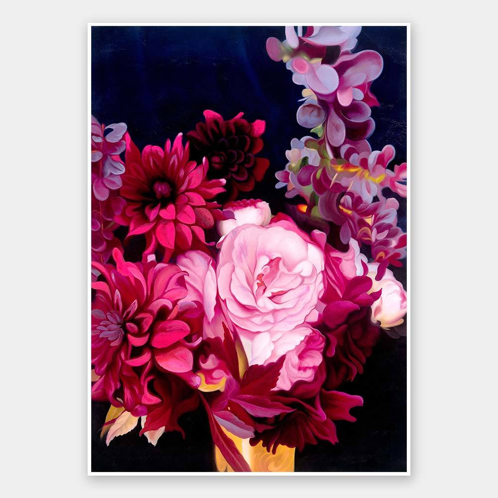 Midnight Blooms Fine Art Print: Set against a dark navy background, the pink hues of this floral piece create a romantic elegance. A stunning addition to a modern or classically styled home or office. 2014 SPRING/SUMMER COLLECTION: THE FIRST COLLECTION