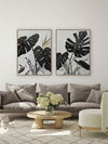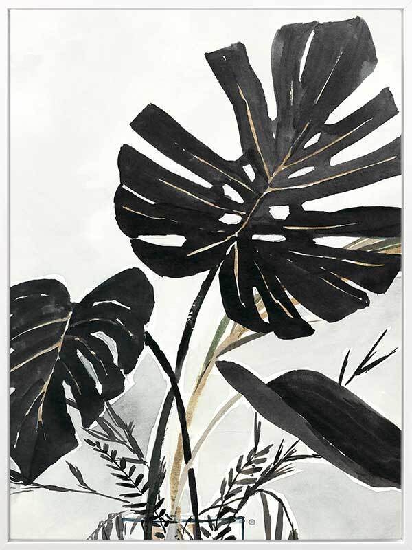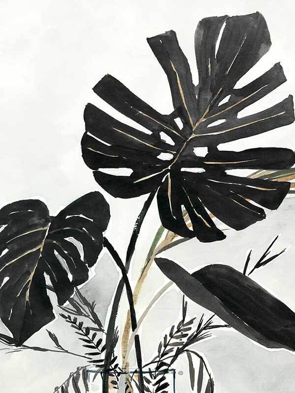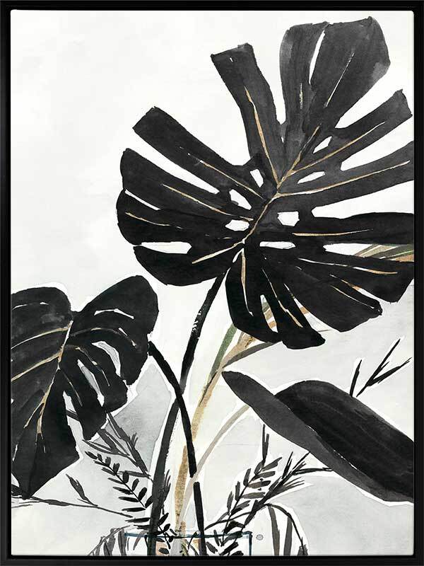 Midnight Tropics II Canvas Art Print - An abstract look at mother nature, this artwork has a textural feel to it with painterly brush strokes and subtle colour blocking in the background, outlining the leaves for greater impact. A monotone palette of black and white is set off by a pop of yellowish-green and cloudy grey.