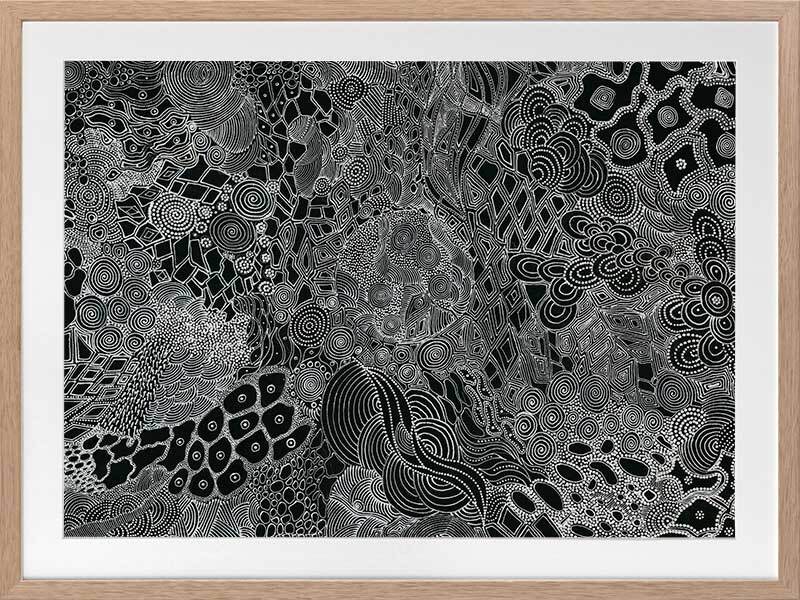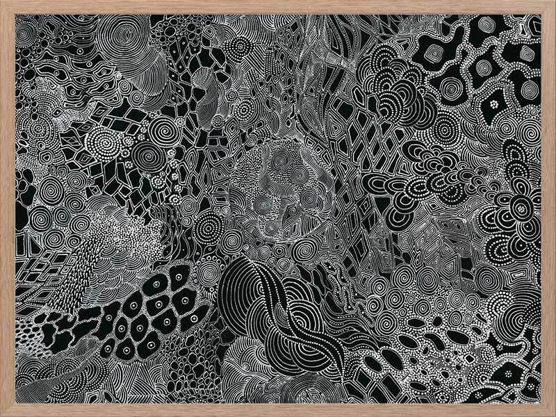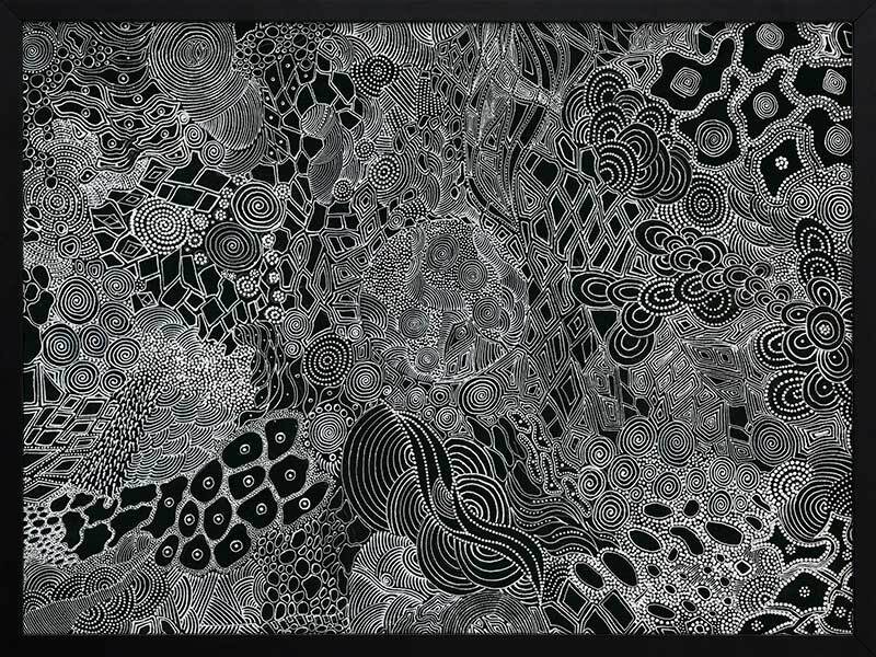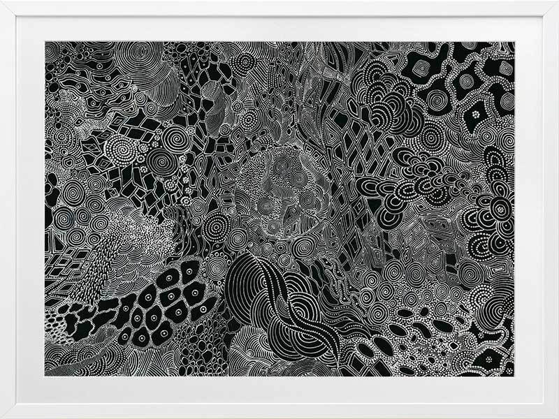 Mina Mina Jukurrpa I Framed Art Print - This Indigenous Aboriginal artwork features intricate white lines and dots which form concentric circles and shapes against a black background in this incredibly detailed piece inspired by Mina Mina, a sacred site near Lake Mackay and the Western Australian border.