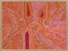 This Indigenous Aboriginal artwork depicts the story of the women that danced in celebrations of the 'mulju' (Summer rains) at the Mina Mina, a very important women's Dreaming site in the Northern Territory of Australia, while collecting 'karlangu' (digging sticks).