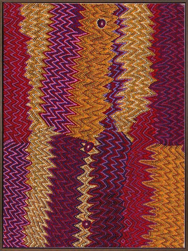 Mina Mina Jukurrpa (Mina Mina Dreaming) IX Dark Pink Canvas Art Print - Striking and bold, this Aboriginal Art print instantly breathes new life into your space with a vivid colour palette and moving lines. This Aboriginal Wall Art features bright yellows, oranges, reds and purples, bringing a sense of warmth to any space. A piece of modern Aboriginal Art, this work showcases the remarkable talent and cultural heritage of a skilled local Aboriginal Artist, making it a true embodiment of Indigenous Artistic expression and storytelling.