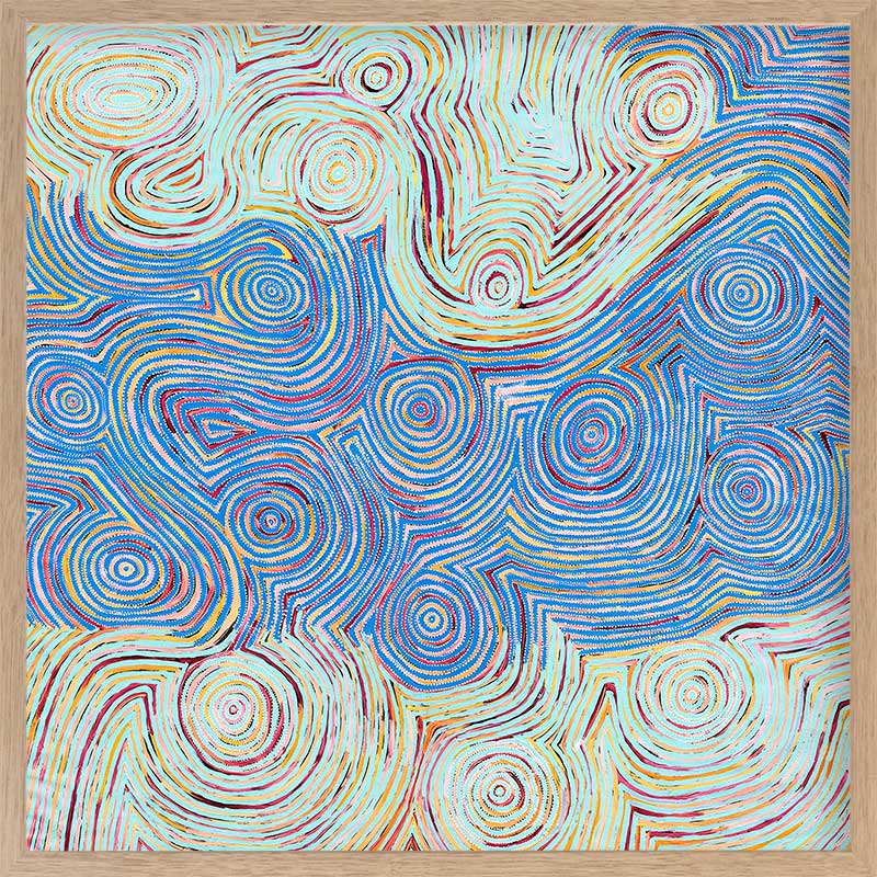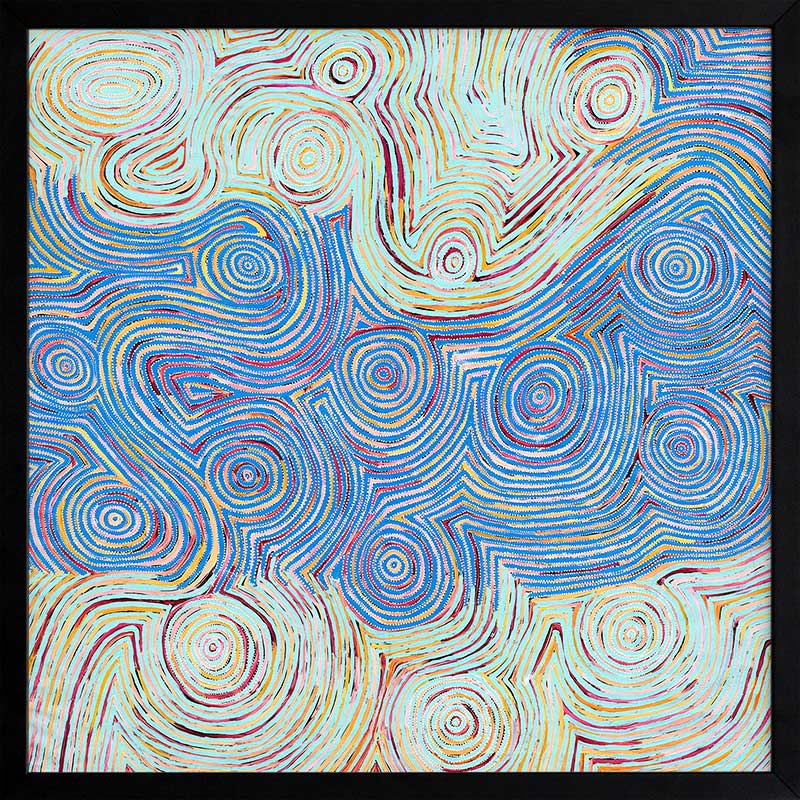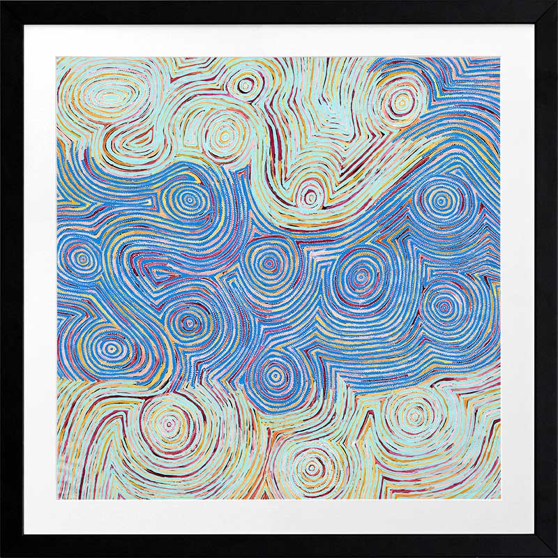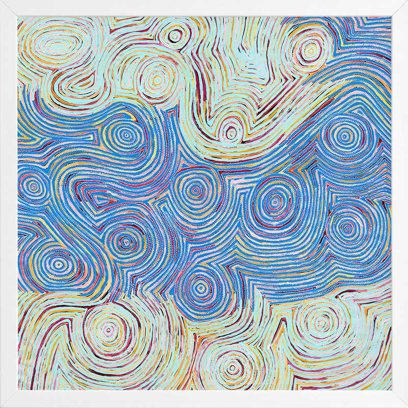 Mina Mina Jukurrpa VI Blue Framed Art Print - Concentric circles and swirls of blue and red, pale mint green and and orange move around each other in a beautiful, wave-like pattern to create this beautiful Indigenous Aboriginal artwork piece, inspired by the Mina Mina Dreaming. The circles are outlined with incredibly intricate dotted details.