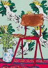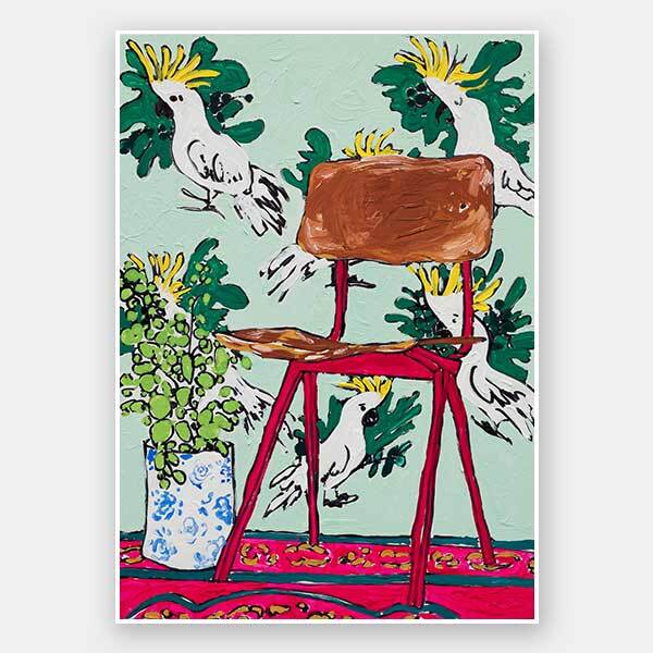 Mint Cockatoo - The use of multiple shades of green contrasts nicely with the single red chair positioned in the centre of this vibrantly decorated room. The cheerful cockatoo wallpaper adorning the wall behind doesn't detract from the stillness of the blue and white vase, nor the bright red flooring shown in this poster print by Lara Meintjes. This fun art print can add a piece of Australia to any room. Lara Meintjes is a US-based, South African painter who isn't afraid to experiment mixing bold colours with soft floral imagery. The depth of creativity in her pieces inspires you to find the calm within the chaos.
