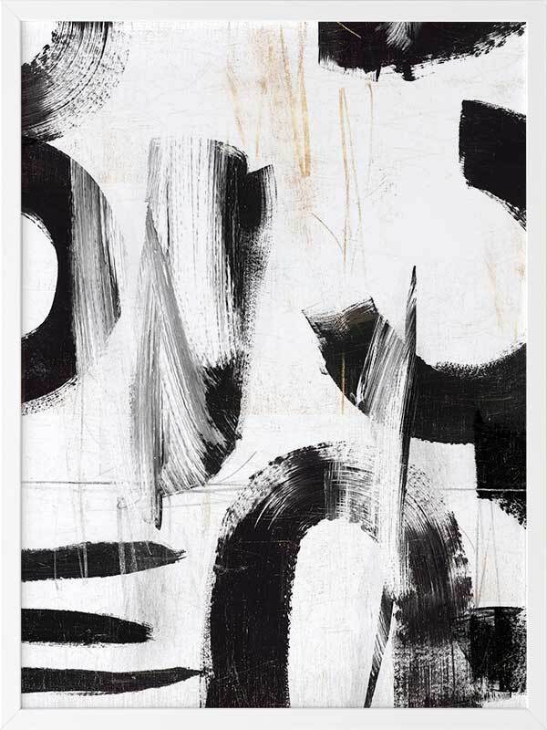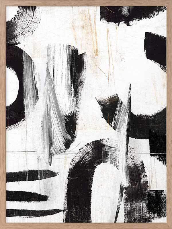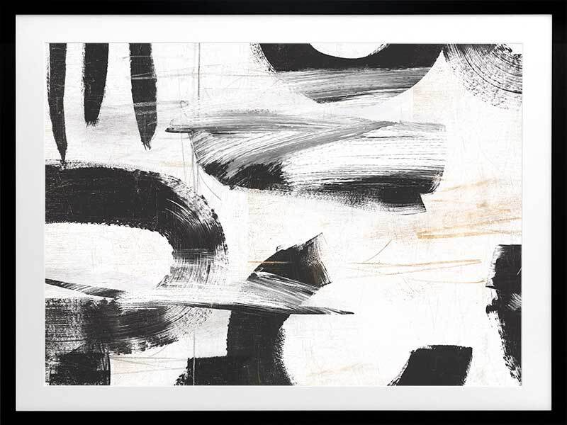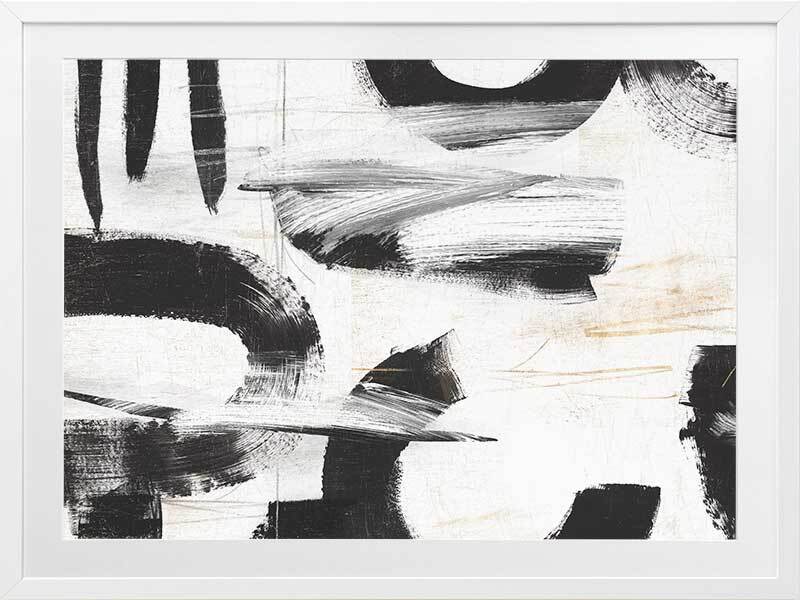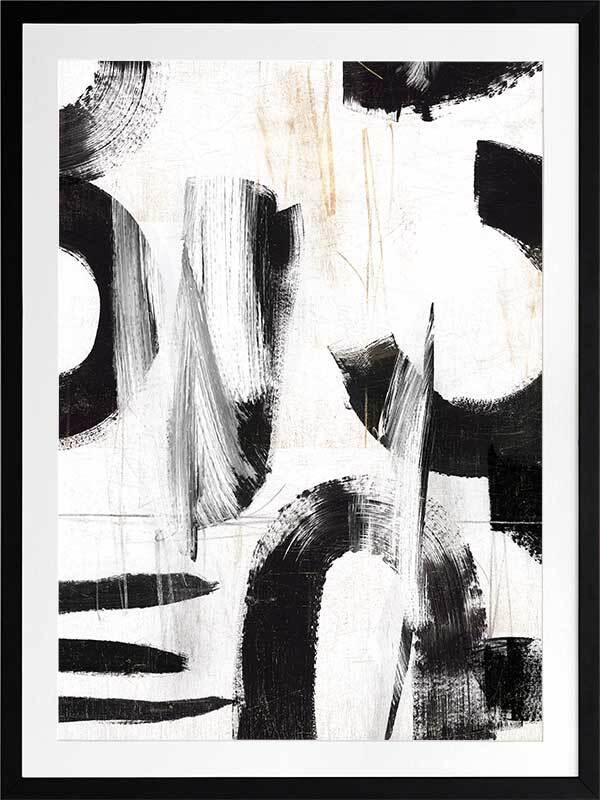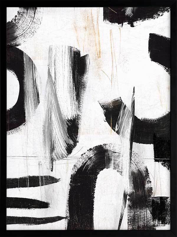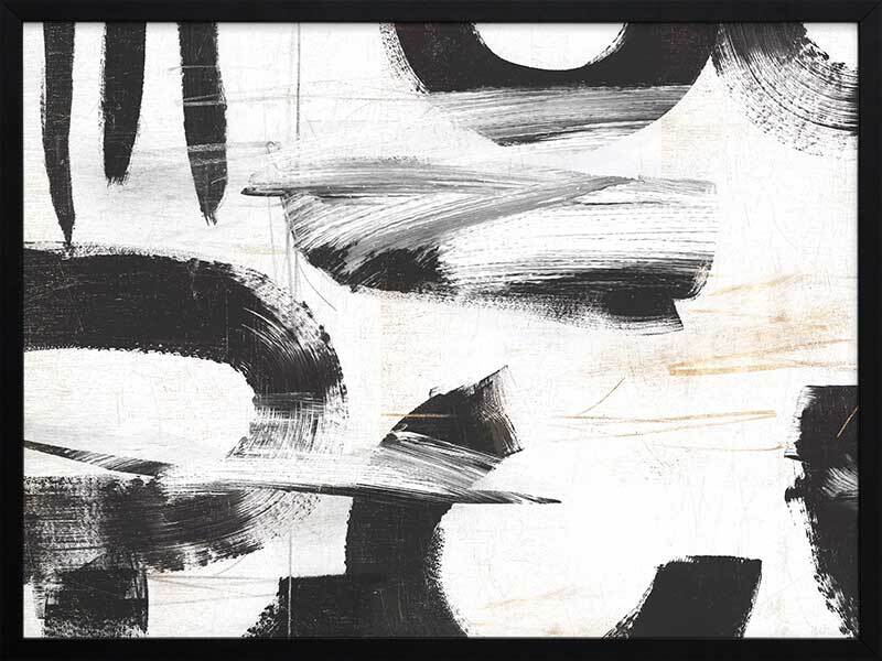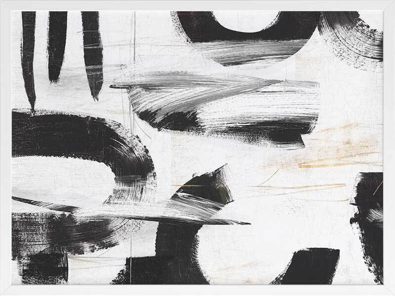 Misunderstood II Framed Art Print - An assortment of visible brushstrokes, large and small, scattered on the canvas in a random, yet structured way. With its careful messiness and simple black and white palette with hints of golden beige, this piece has an organic feel to it that breathes life into any space.