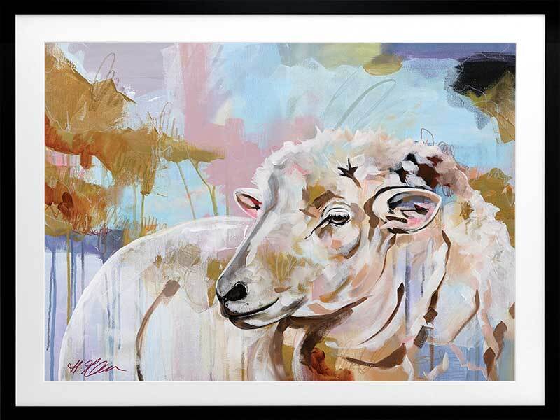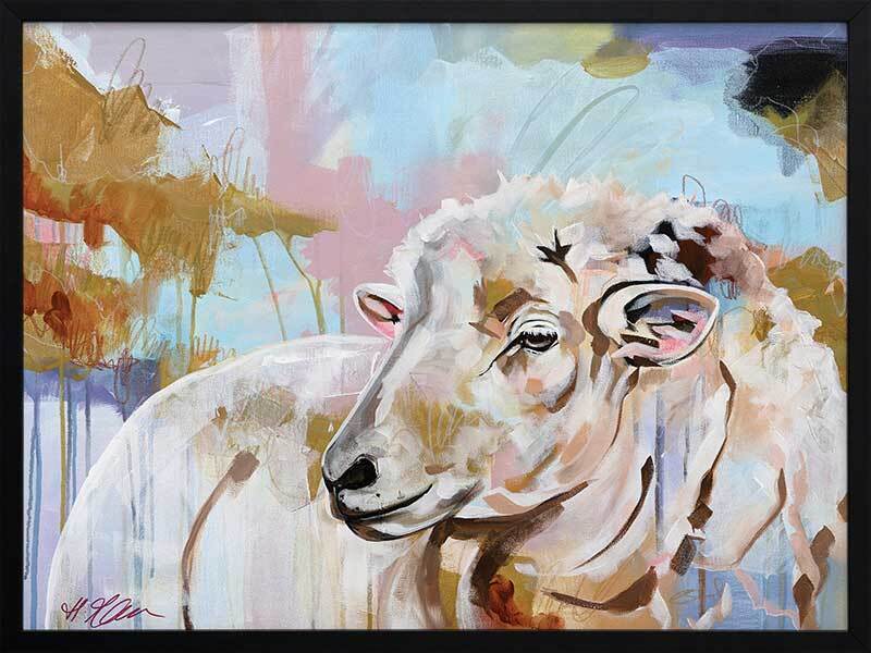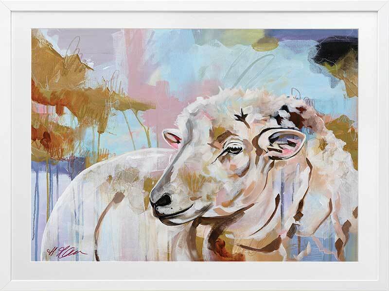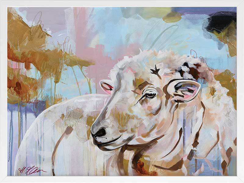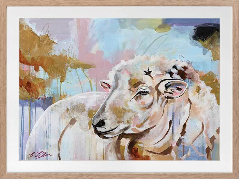 Monday Morning Multicolour Framed Art Print - As the cool fog of dawn drifts through the farm, sun rising in the distance casting all its breathtaking colours onto the grassy grounds, a lone sheep raises her head to watch as she does every morning. A moving piece that adds character and charm to any space, with a multicolour palette of pastel blue, pink, green and warm brown to suit any interior.