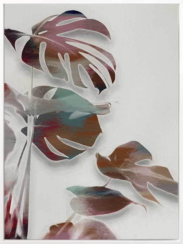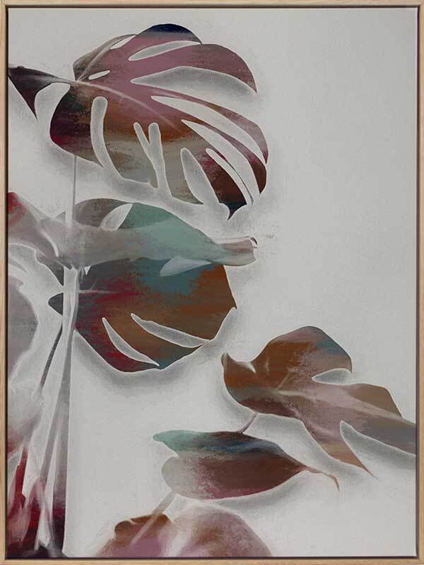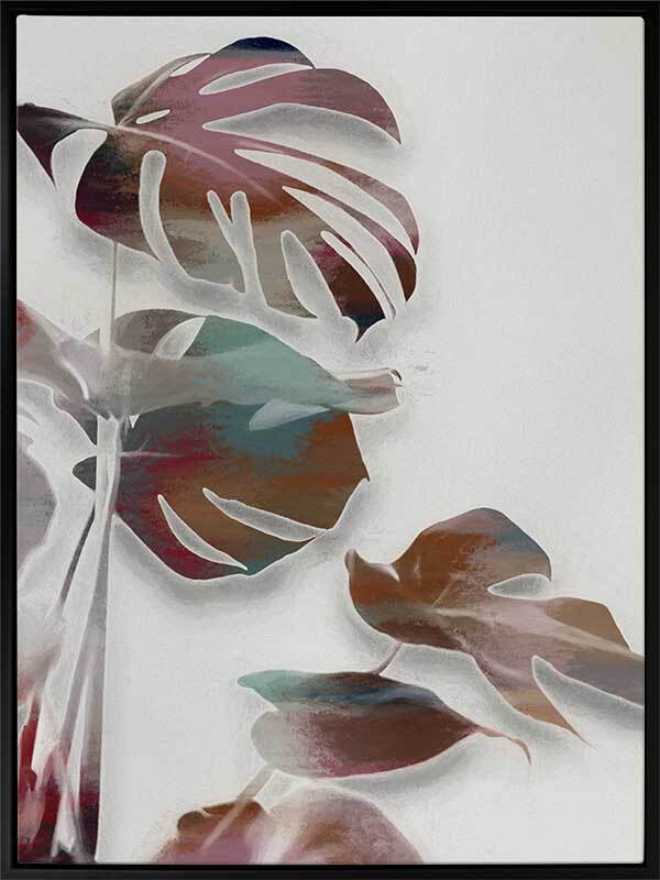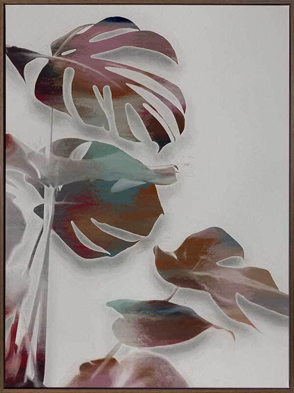 Monstera Major II Canvas Art Print: A moody, tropical inspired artwork featuring a textured burgundy, brown and grey monstera plant on a grey background. Pairs with Monstera Major I. 2019 AUTUMN/WINTER COLLECTION: ODYSSEY
