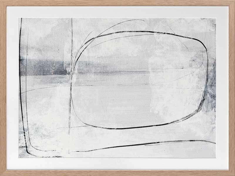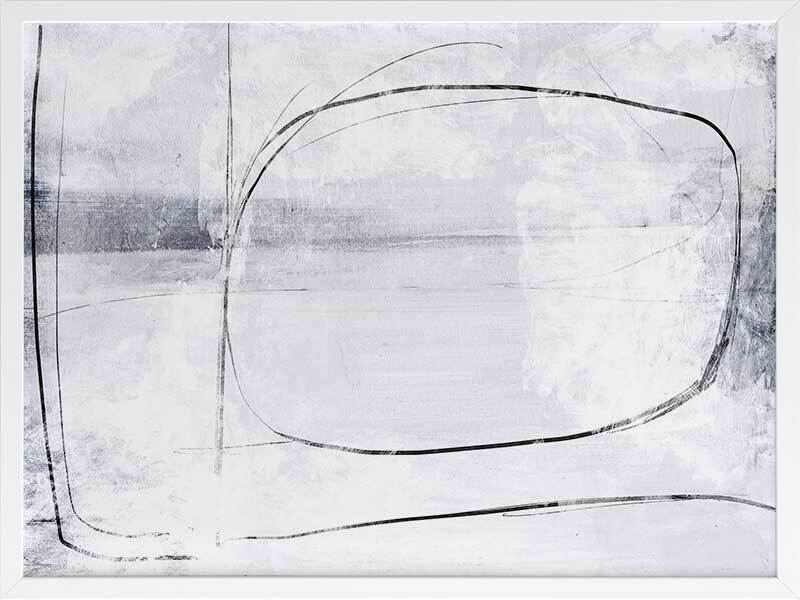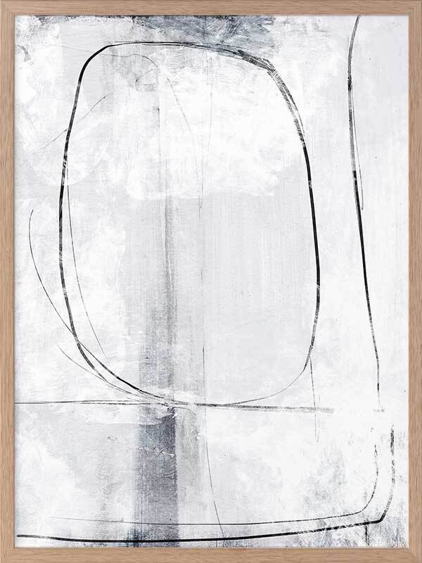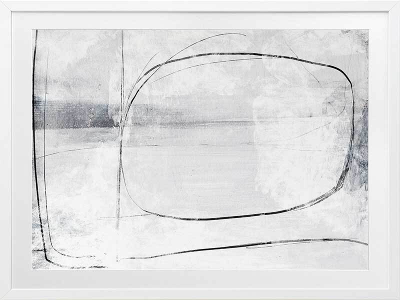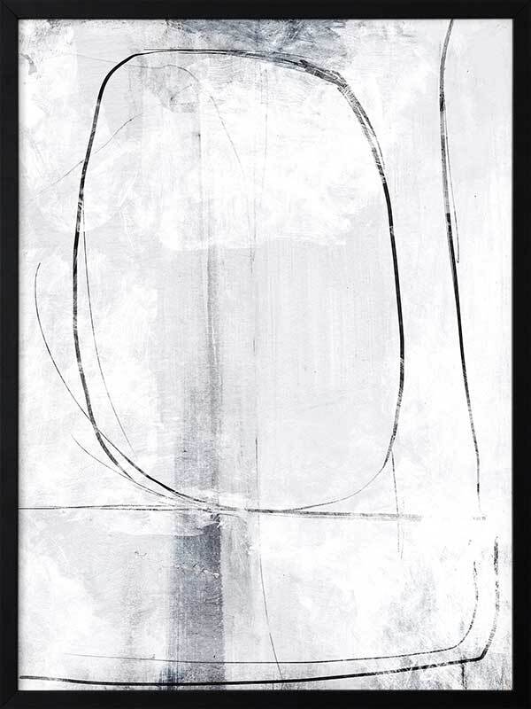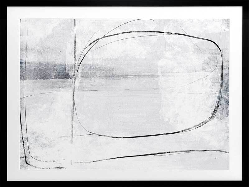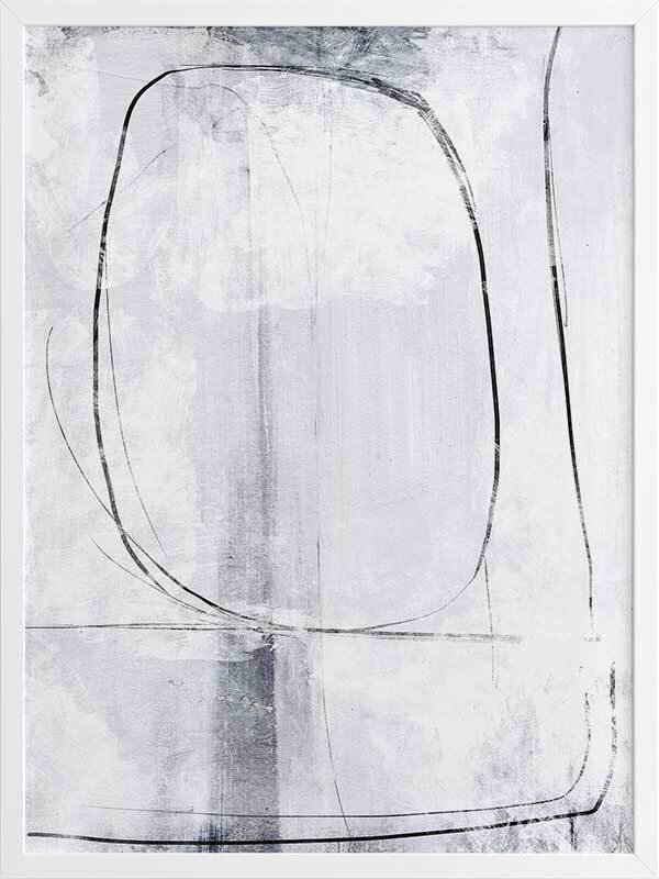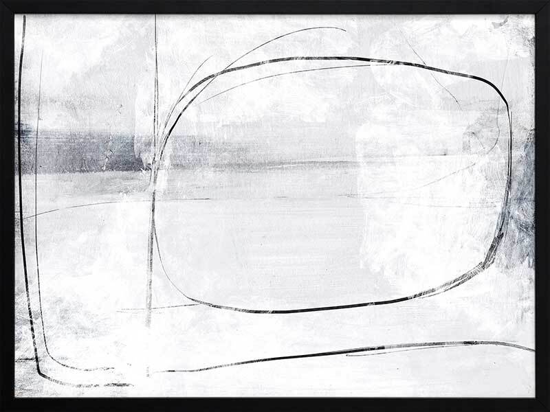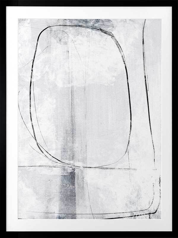 Mood Framed Art Print - A unique abstract art print with a strong grungy feel, perfect for a monochrome room. Features textures in a muted grey, black and white palette to contrast with the abstract fine line strokes.