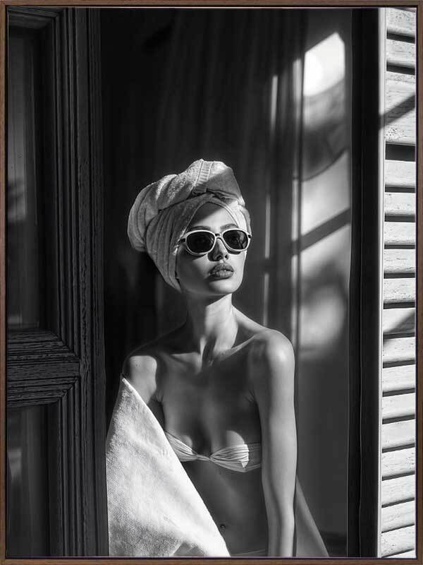 Morning Glow Canvas Art Print - Bring pure glamour to any space with this black-and-white artwork from our exclusive limited edition collection with interior designer Shaynna Blaze. Capturing a quiet moment as the morning light shines through the window, a woman sits thoughtfully, a towel wrapped around her head, sunglasses perched effortlessly, wondering which cocktail she'll order by the pool. The monochrome palette exudes an unmistakable Art Deco flair, blending fashionable old-world charm with modern sensibility. Whether in a living room or bedroom, its glamorous yet relaxed feel enhances any interior design style, creating a balanced mix of leisure and luxury.
