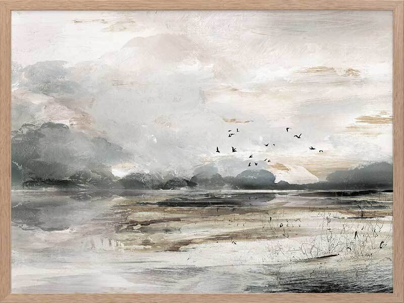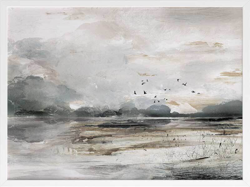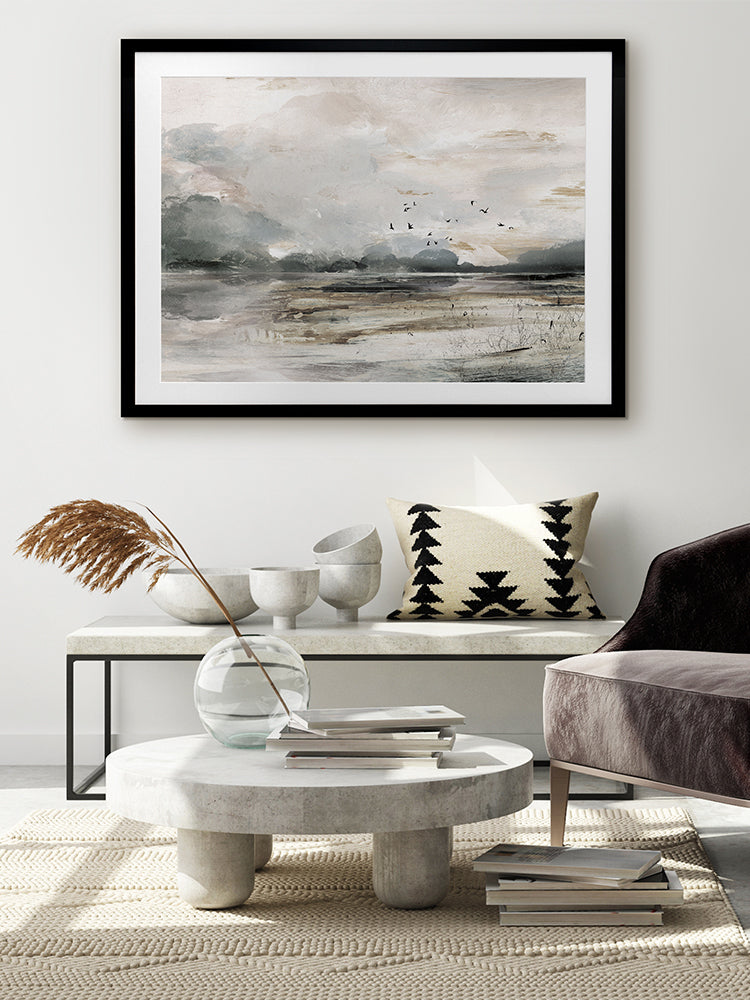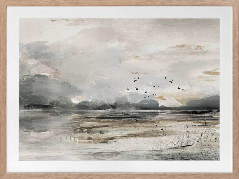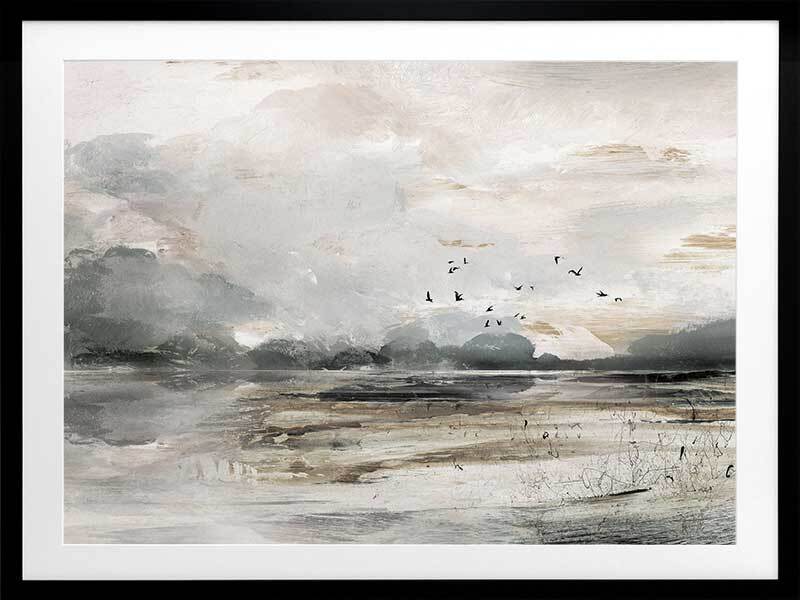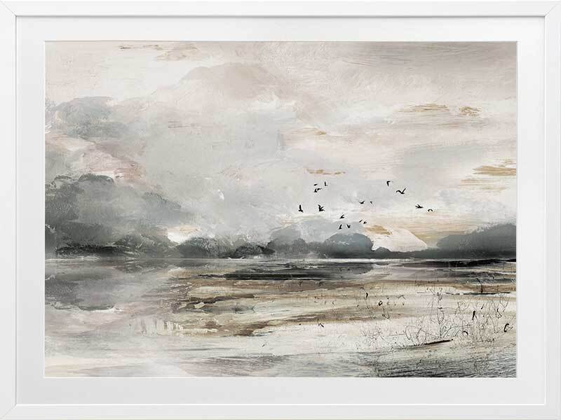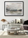 Morning View Framed Art Print - This moody landscape captures the emotion of shifting weather and light. Featuring a rustic, semi-abstract seascape which has been hand painted using greys, whites, browns and black acrylics before being converted to a print.
