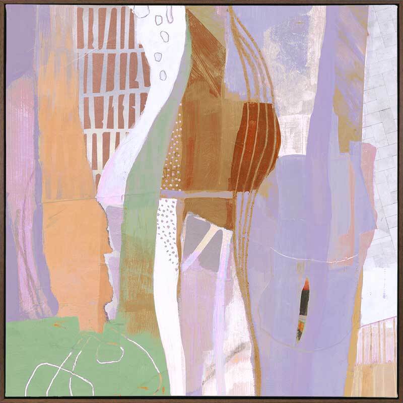 Mosaic Canvas Art Print - A collage of random lines, shapes, and patterns come together in perfect harmony, celebrating the beauty in all things unconventional. With a vibrant colour palette featuring lilac undertones and pops of khaki green and warm brown, this piece has a textural feel to it, perfect for bringing a dynamic flair to any space.