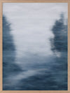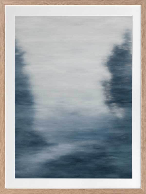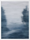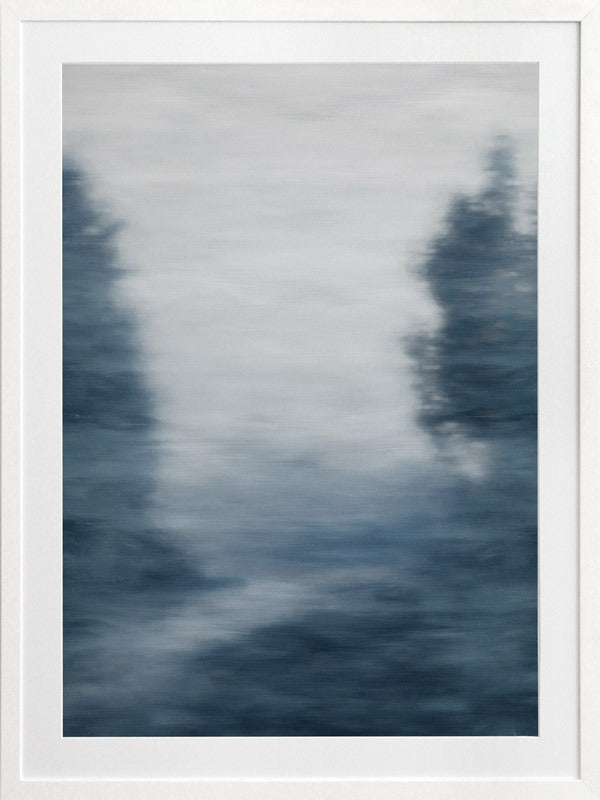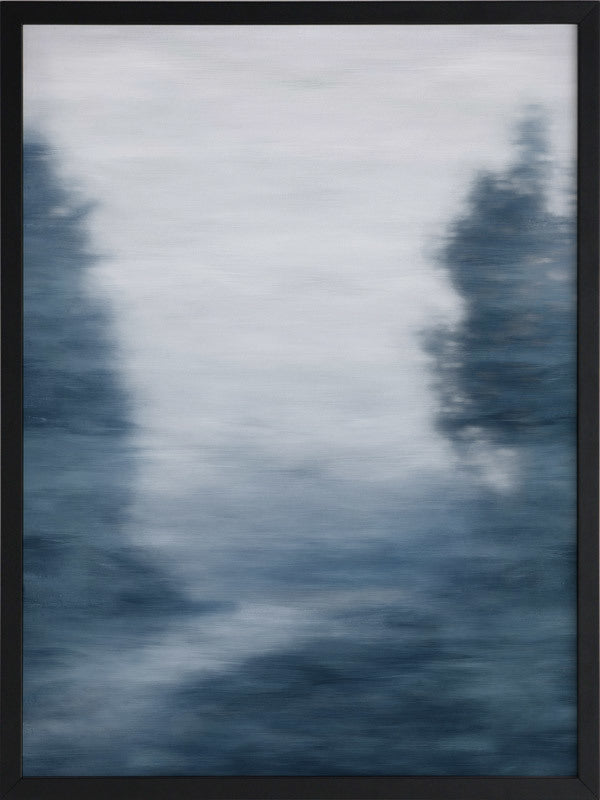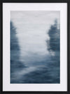 Mountain Air Framed Print: A blurred landscape artwork featuring a navy blue forest silhouetted against a grey sky. 2019 AUTUMN/WINTER COLLECTION: ODYSSEY