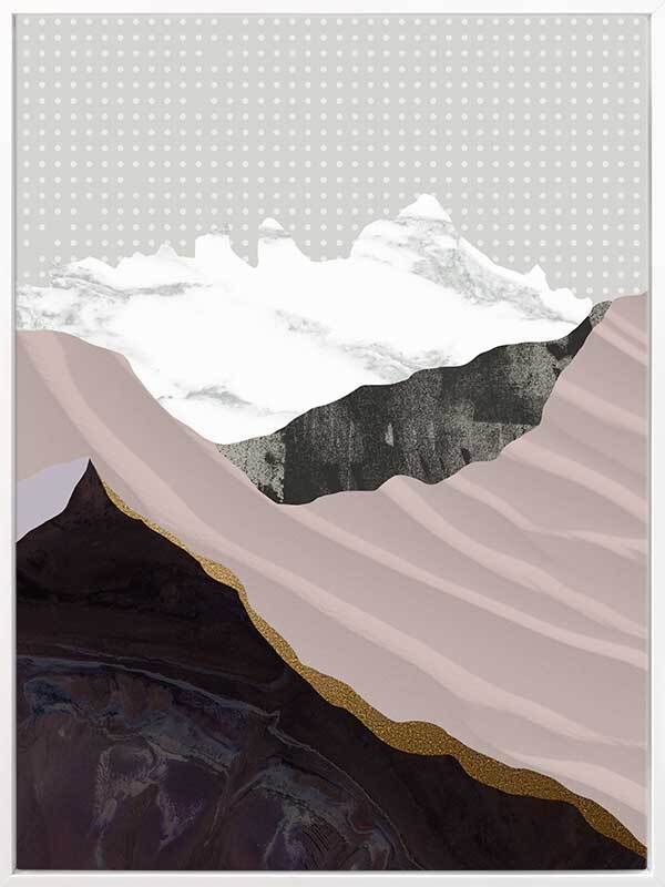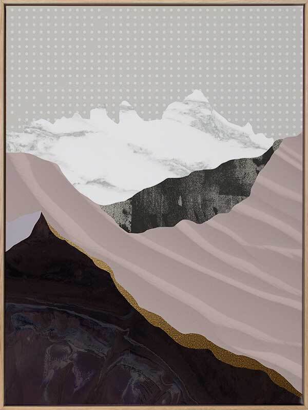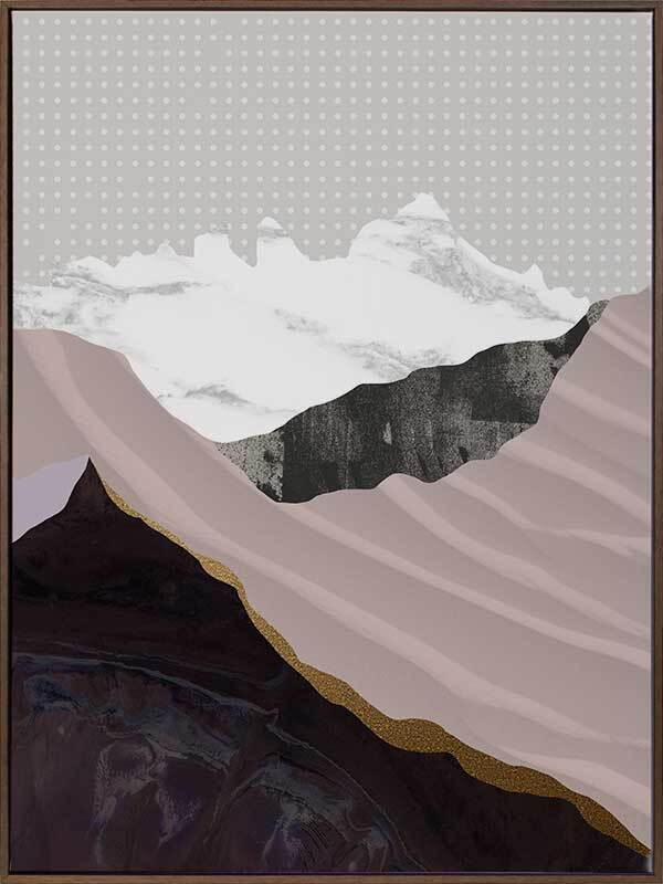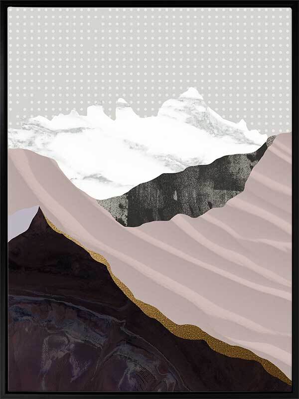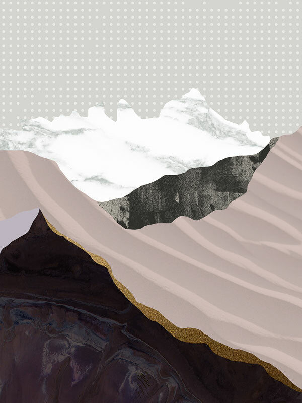Moving Mountains I Canvas Art Print: A graphic artwork featuring overlapping textures and shapes that form a mountain range. Features a soft lilac and mauve colour palette with pops of black and white, on top of a white and grey polka dot background. Pairs with Moving Mountains II. 2019 AUTUMN/WINTER COLLECTION: ODYSSEY