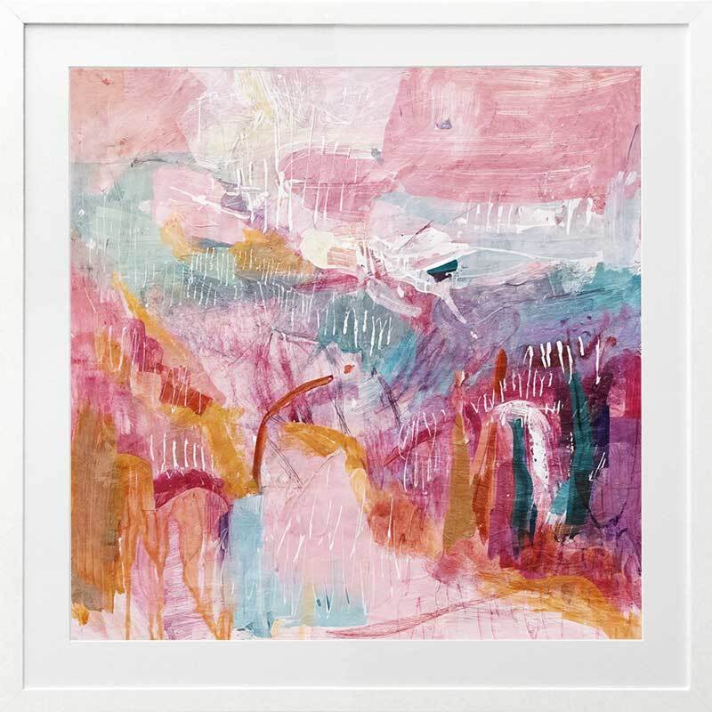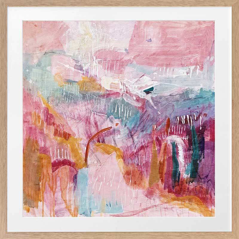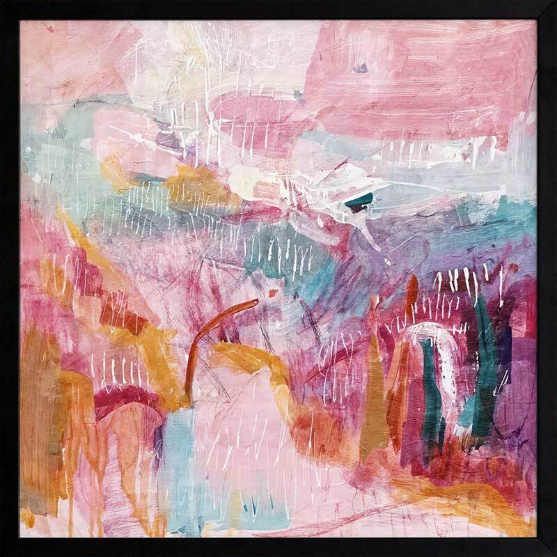 Multicolour Reverie I Framed Art Print - This abstract artwork is a symphony of texture and hue, an oversized abstract art piece that commands attention. Strokes of pink, yellow, and blue cascade across the canvas, creating a vibrant contrast that feels both wild and thoughtfully placed. A captivating choice as living room wall art, its composition suggests a landscape reimagined through a dream.