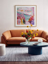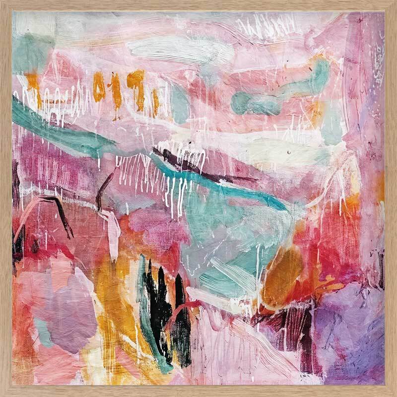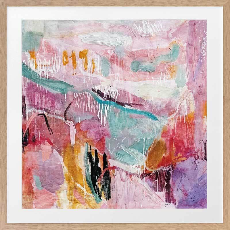 Multicolour Reverie II Framed Art Print - This abstract artwork is a symphony of texture and hue, an oversized abstract art piece that commands attention. Strokes of pink, yellow, and blue cascade across the canvas, creating a vibrant contrast that feels both wild and thoughtfully placed. A captivating choice as living room wall art, its composition suggests a landscape reimagined through a dream.