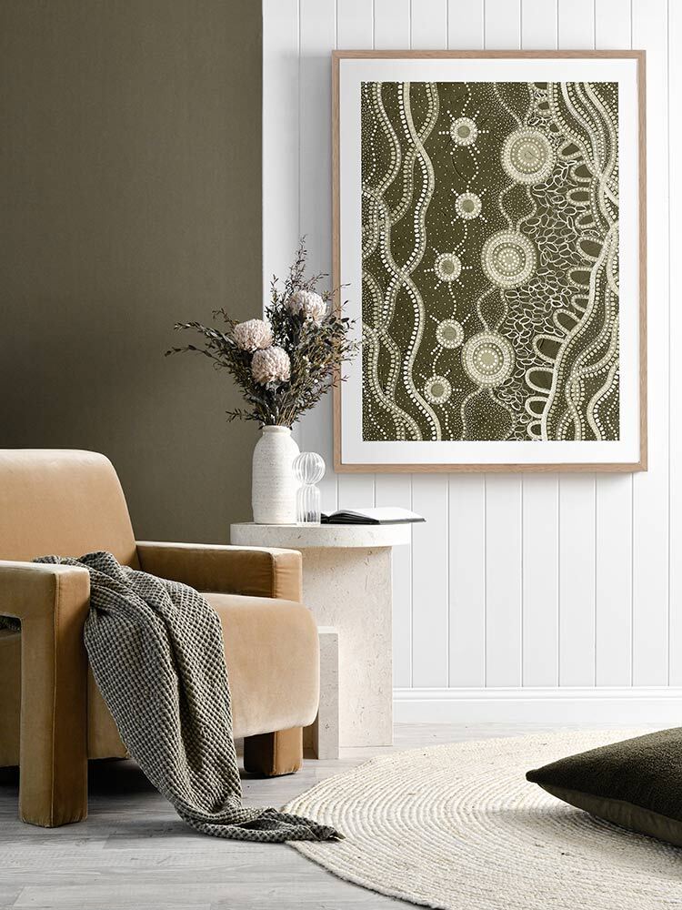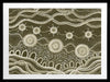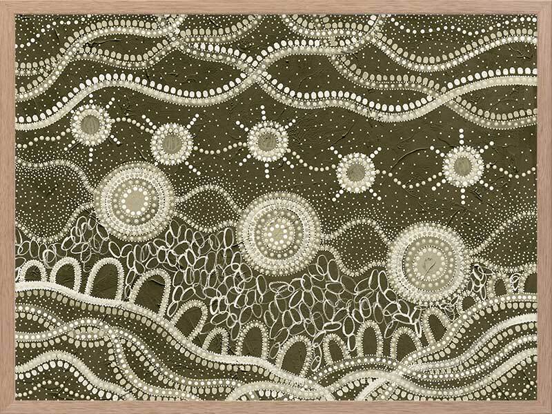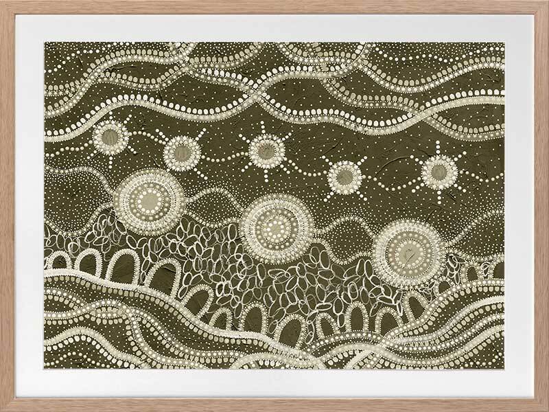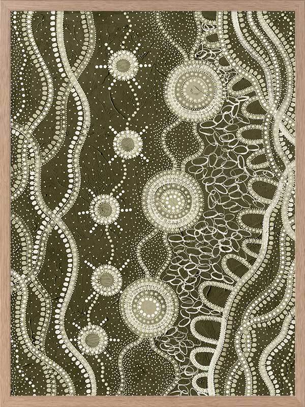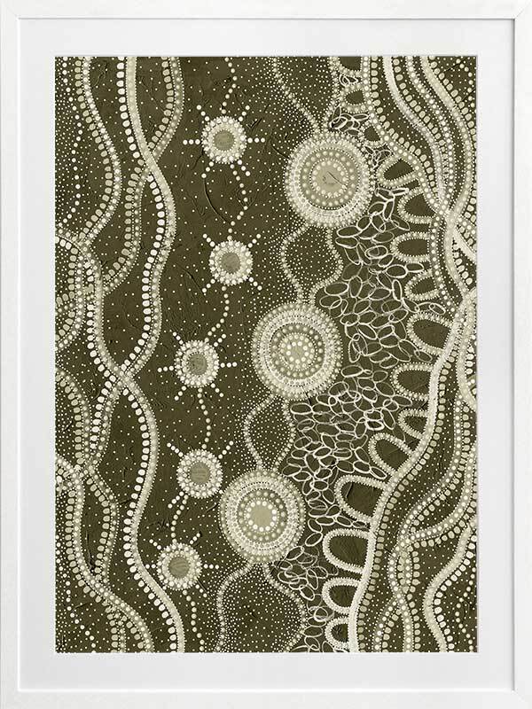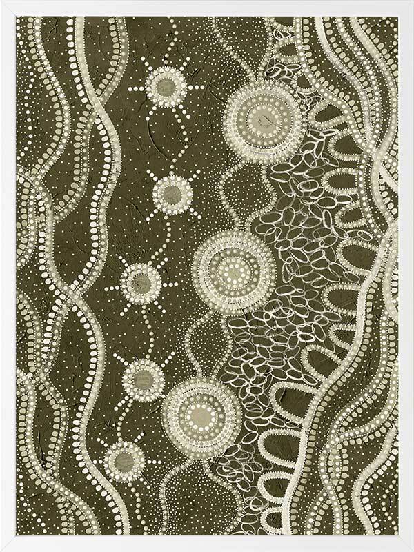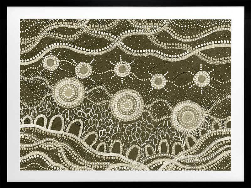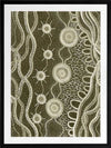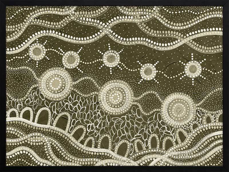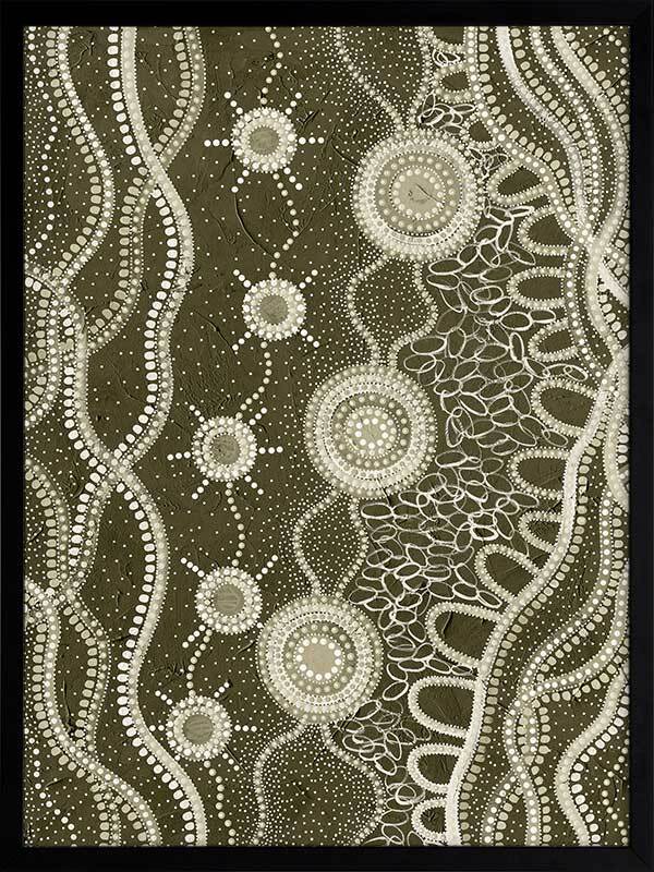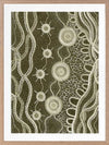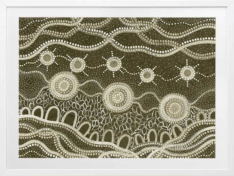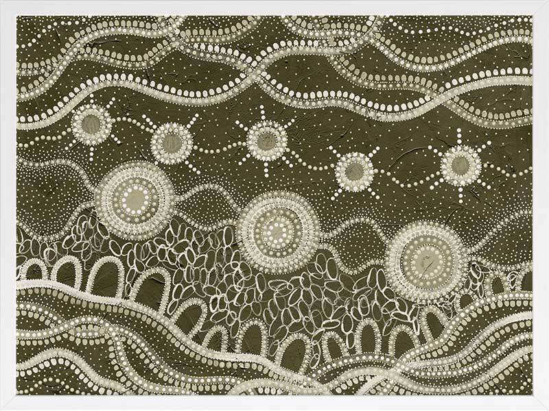 Murriyang Green Framed Art Print - Murriyang - "Sky World, Where Biyaami, the Great Creator Lives". A truly magical piece featuring a beautiful blend of shapes, lines and dots, resulting in a unique composition that adds a sense of depth to your space. Colour palette includes a khaki green backdrop, bringing forward tones of lighter green and soft white.